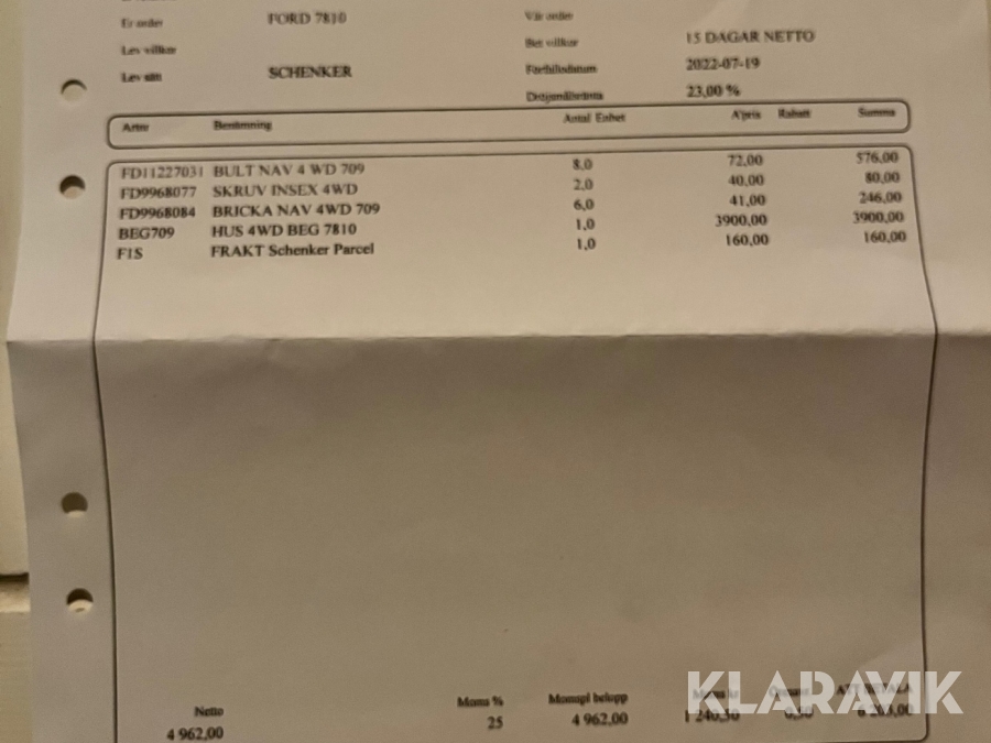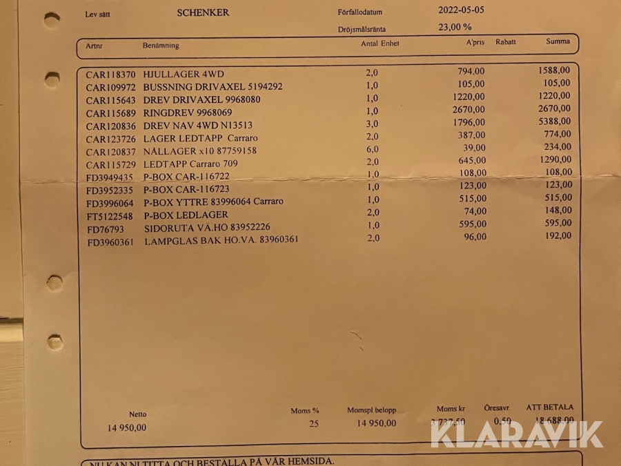 Boka frakt? Det finns ingen specifik information om frakt för just det här objektet, men om du skickar oss en förfrågan via vårt fraktformulär, så undersöker vi möjligheten. Paket, EU-pall eller större maskin? Klaravik har fraktavtal med Schenker och i de fall vi kan hjälpa till med frakt gäller det objekt som ryms i paket eller inom en EU-pall (upp till 120*80 cm och 990 kg). Det går att beställa frakt inom Sverige, dock inte till utlandet. Vid frakt på större maskiner rekommenderar vi gärna transportföretag som du kan kontakta.