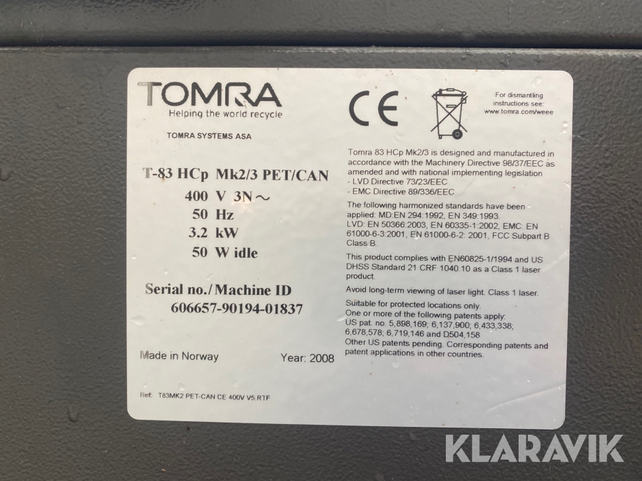Pantmaskin Tomra T-83 HCP MK2/3 PET/CAN
