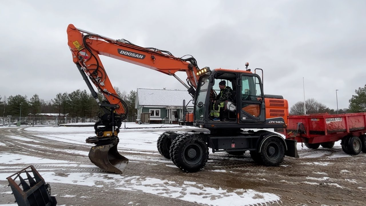Grävmaskin Doosan DX 140W-5 med Bigab T-10 Tiltrotator, jordborr och skopor.