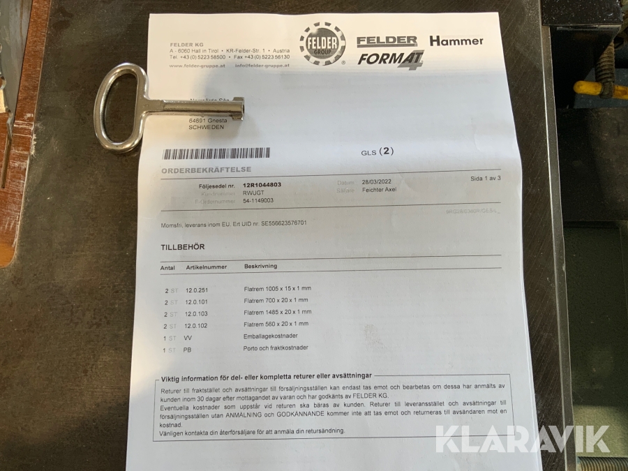 Boka frakt? Det finns ingen specifik information om frakt för just det här objektet, men om du skickar oss en förfrågan via vårt fraktformulär, så undersöker vi möjligheten. Paket, EU-pall eller större maskin? Klaravik har fraktavtal med Schenker och i de fall vi kan hjälpa till med frakt gäller det objekt som ryms i paket eller inom en EU-pall (upp till 120*80 cm och 990 kg). Det går att beställa frakt inom Sverige, dock inte till utlandet. Vid frakt på större maskiner rekommenderar vi gärna transportföretag som du kan kontakta.