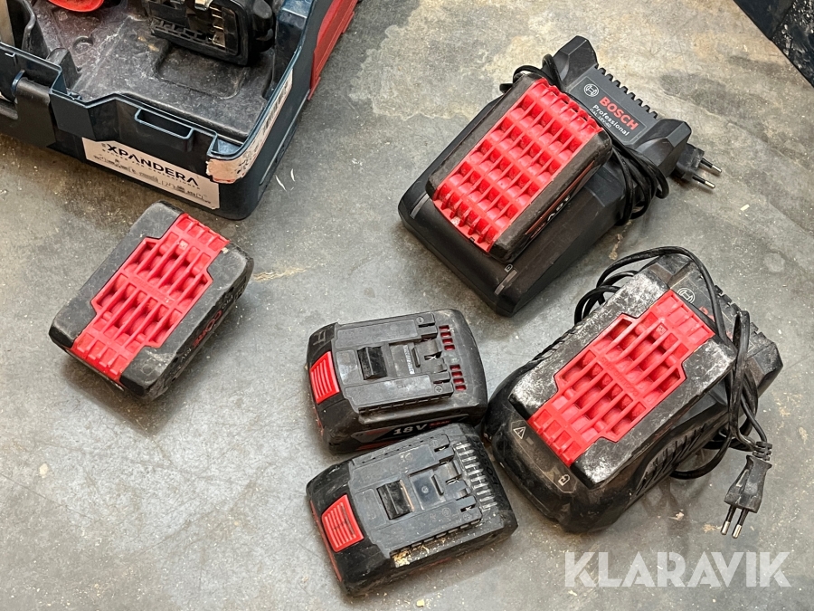 Med laddare och batterier.