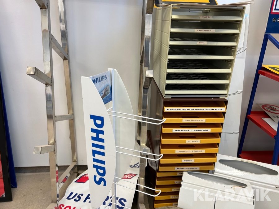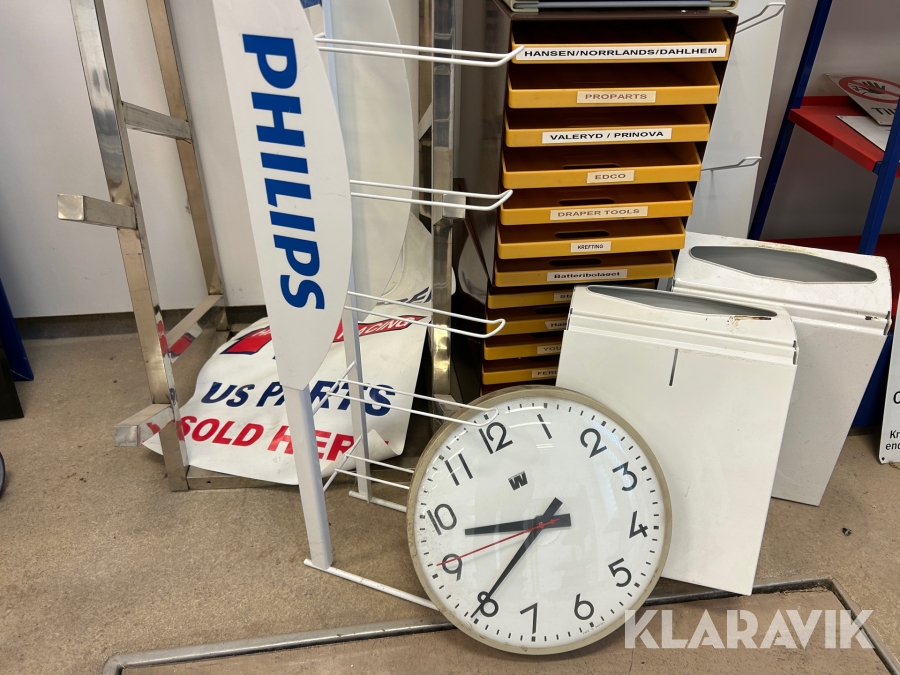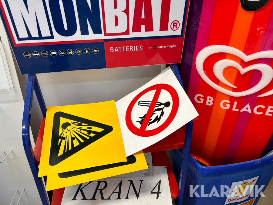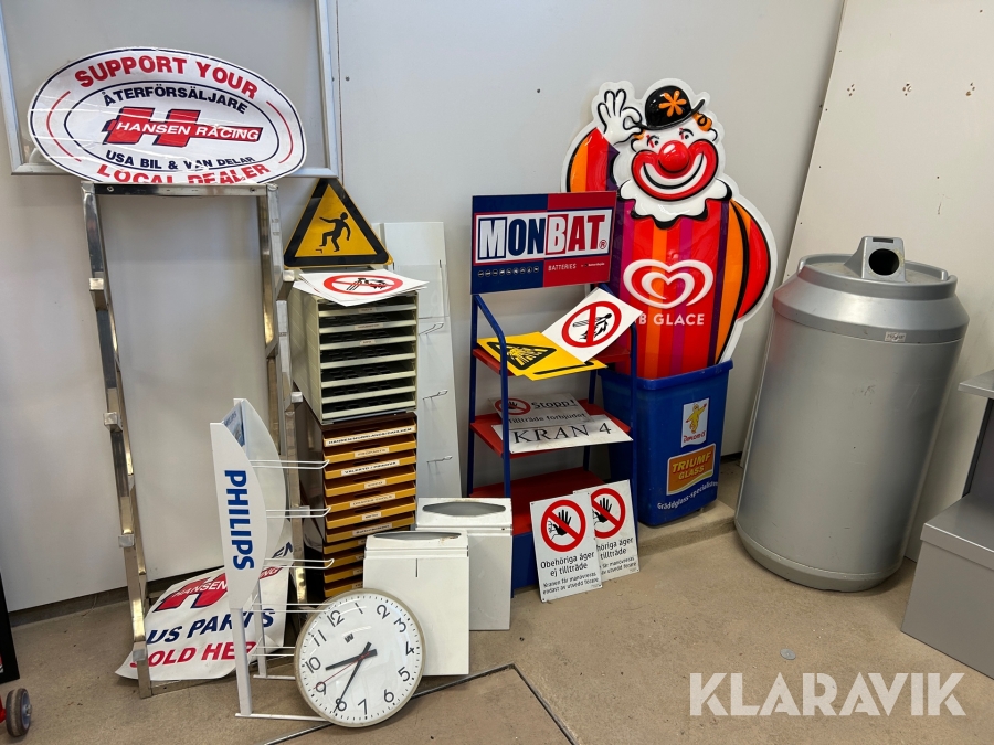 Diverse reklam skyltar och hyllor