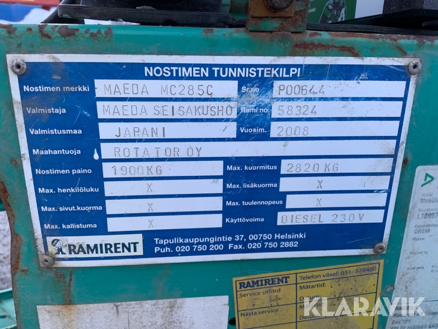 Pga platsbrist är det viktigt att du som köpare hämtar inom 12 dagar från auktionsavslut. Vid frågor om frakt kontakta trade@ramirent.se.