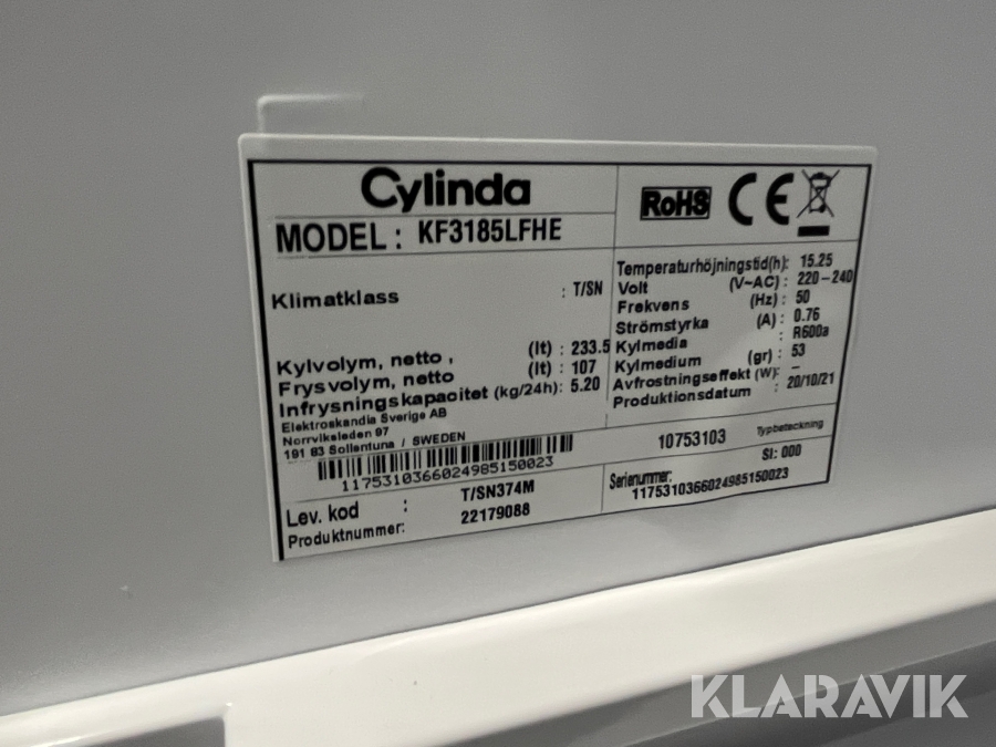 Cylinda kyl/frys, höjd ca. 186cm