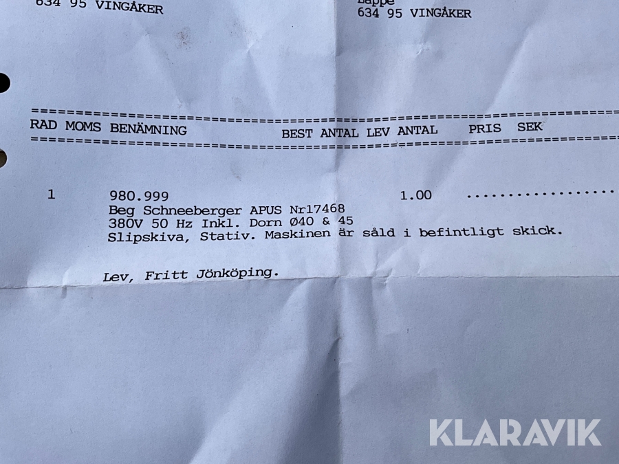 Du som köpare är skyldig att kontrollera objektet vid hämtning. Skiljer sig något avsevärt jämfört med informationen på klaravik.se? Kontakta då Klaravik innan du tar objektet från platsen. Läs fullständiga köpvillkor.