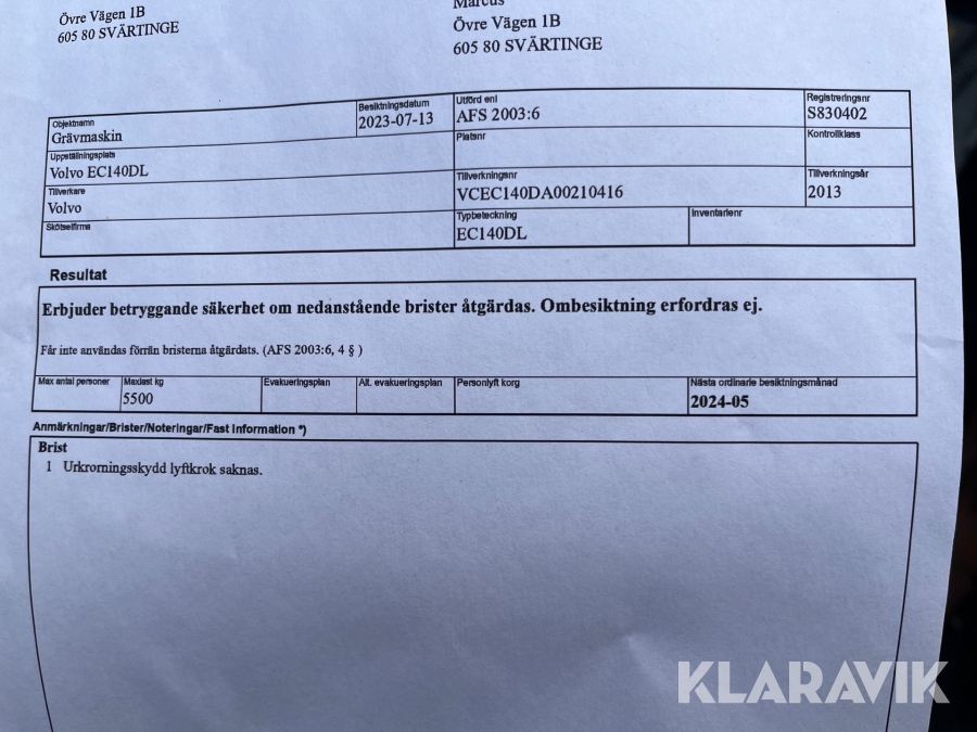 Du som köpare är skyldig att kontrollera objektet vid hämtning. Skiljer sig något avsevärt jämfört med informationen på klaravik.se? Kontakta då Klaravik innan du tar objektet från platsen. Läs fullständiga köpvillkor.
