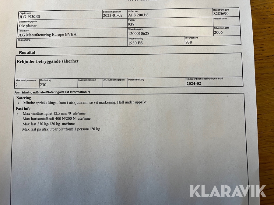 Du som köpare är skyldig att kontrollera objektet vid hämtning. Skiljer sig något avsevärt jämfört med informationen på klaravik.se? Kontakta då Klaravik innan du tar objektet från platsen. Läs fullständiga köpvillkor.