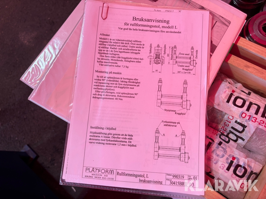 Boka frakt? Det finns ingen specifik information om frakt för just det här objektet, men om du skickar oss en förfrågan via vårt fraktformulär, så undersöker vi möjligheten. Paket, EU-pall eller större maskin? Klaravik har fraktavtal med Schenker och i de fall vi kan hjälpa till med frakt gäller det objekt som ryms i paket eller inom en EU-pall (upp till 120*80 cm och 990 kg). Det går att beställa frakt inom Sverige, dock inte till utlandet. Vid frakt på större maskiner rekommenderar vi gärna transportföretag som du kan kontakta.