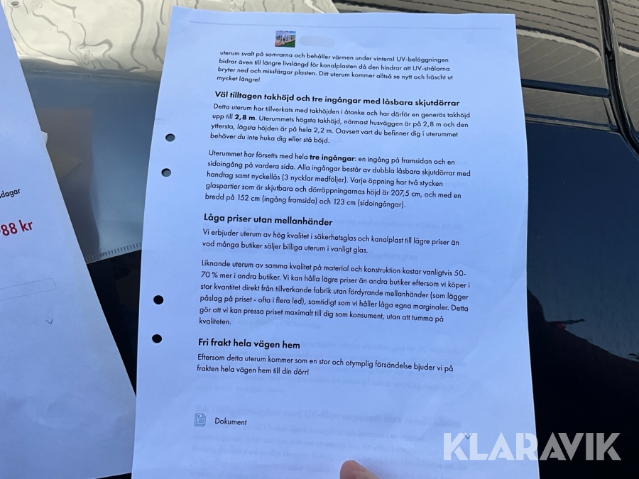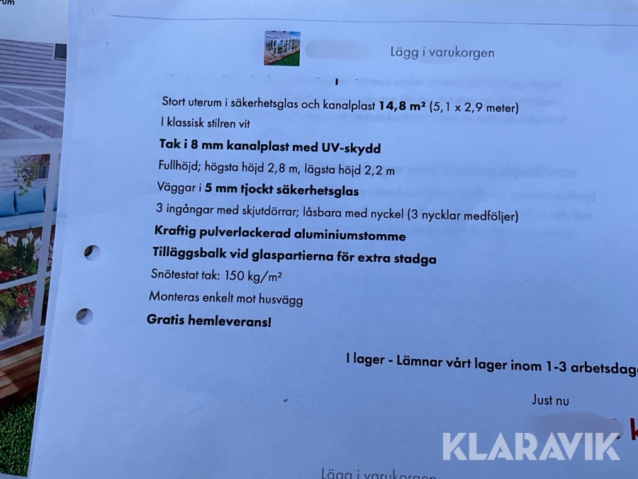 Du som köpare är skyldig att kontrollera objektet vid hämtning. Skiljer sig något avsevärt jämfört med informationen på klaravik.se? Kontakta då Klaravik innan du tar objektet från platsen. Läs fullständiga köpvillkor.