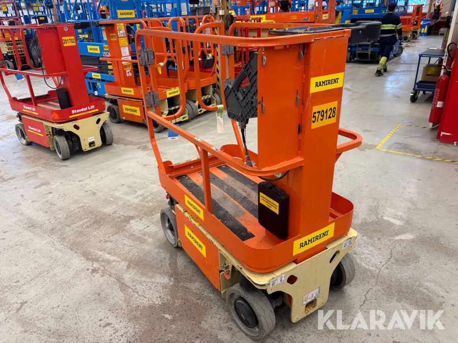 Hydrauldriven pelarlift med tyst och mjuk drift. Denna modell har solida avtrycksfria däck och passar för miljöer med plant och hårt underlag. Genom sin kompakta design är den lättmanövrerad i trånga utrymmen som t.ex. gallerior, kontor och varuhus. Körbar vid full höjd. Servicevänlig och bara 4st hydraulslangar minimerar läckagerisken. Når full höjd på 12 sek.