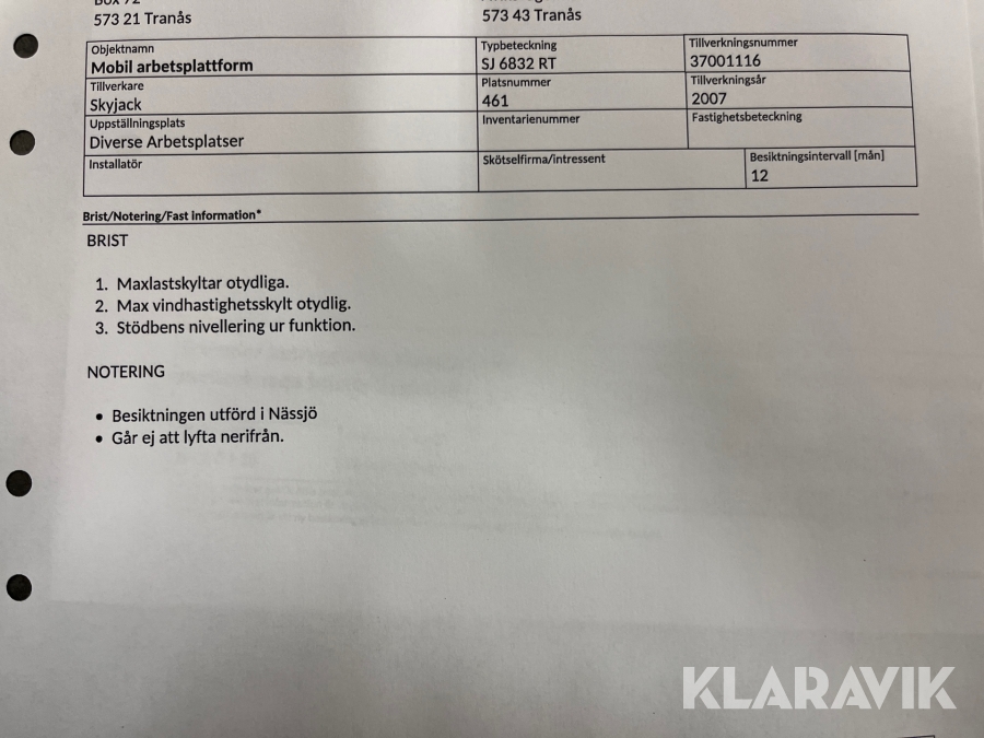 Du som köpare är skyldig att kontrollera objektet vid hämtning. Skiljer sig något avsevärt jämfört med informationen på klaravik.se? Kontakta då Klaravik innan du tar objektet från platsen. Läs fullständiga köpvillkor.