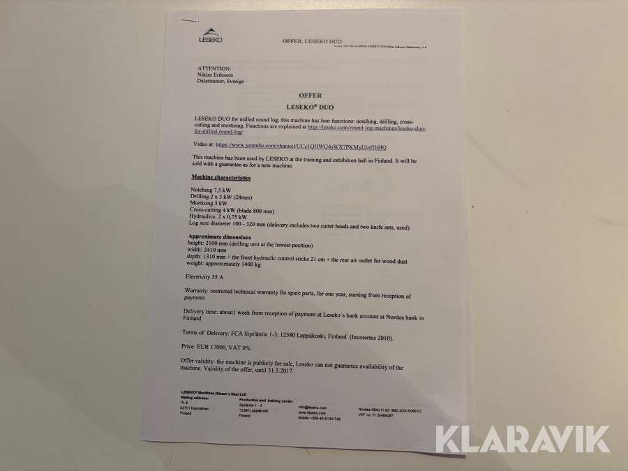 Boka frakt? Det finns ingen specifik information om frakt för just det här objektet, men om du skickar oss en förfrågan via vårt fraktformulär, så undersöker vi möjligheten. Paket, EU-pall eller större maskin? Klaravik har fraktavtal med Schenker och i de fall vi kan hjälpa till med frakt gäller det objekt som ryms i paket eller inom en EU-pall (upp till 120*80 cm och 990 kg). Det går att beställa frakt inom Sverige, dock inte till utlandet. Vid frakt på större maskiner rekommenderar vi gärna transportföretag som du kan kontakta.