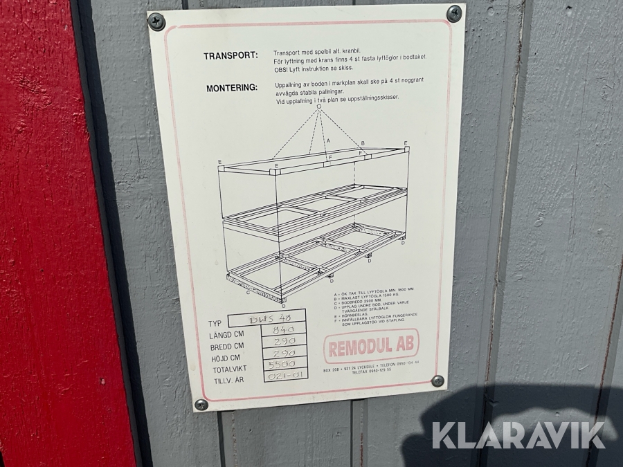 For sheds and containers (10 feet and larger), loading assistance can be purchased. Payment is made either by invoice or by card at the seller's location. The cost per lift is SEK 500 + VAT.