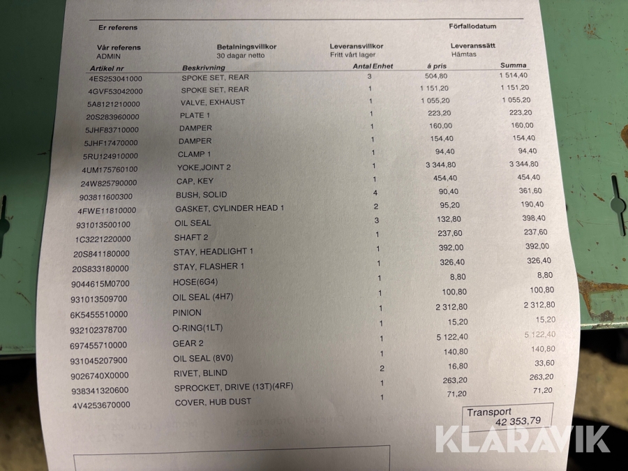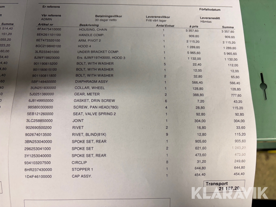 Boka frakt? Det finns ingen specifik information om frakt för just det här objektet, men om du skickar oss en förfrågan via vårt fraktformulär, så undersöker vi möjligheten. Paket, EU-pall eller större maskin? Klaravik har fraktavtal med Schenker och i de fall vi kan hjälpa till med frakt gäller det objekt som ryms i paket eller inom en EU-pall (upp till 120*80 cm och 990 kg). Det går att beställa frakt inom Sverige, dock inte till utlandet. Vid frakt på större maskiner rekommenderar vi gärna transportföretag som du kan kontakta.