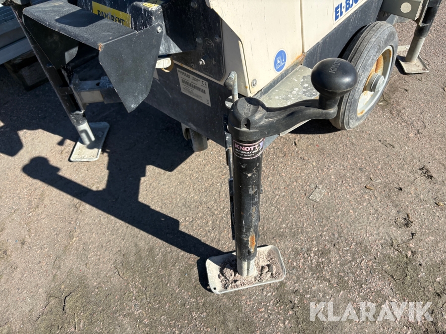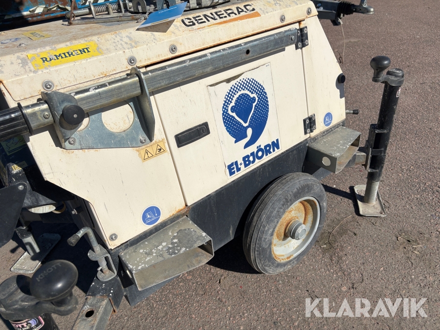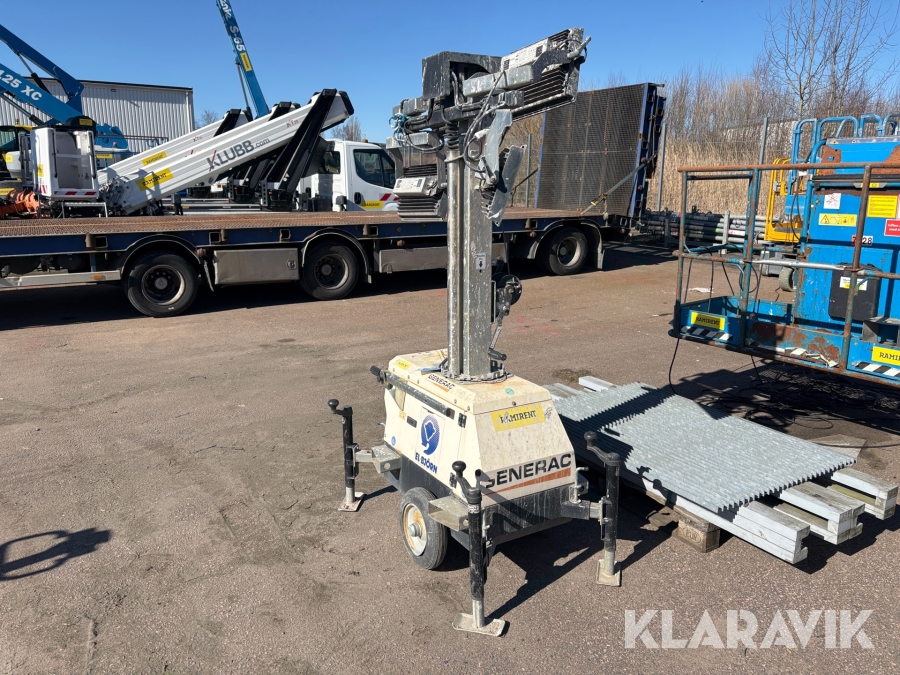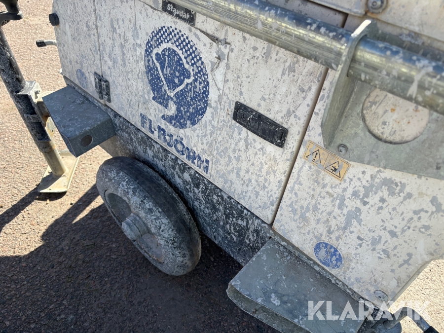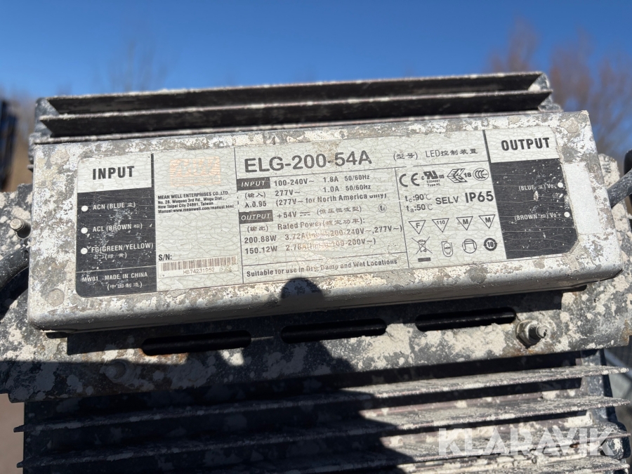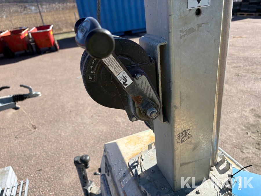Belysningsmast med 4x150W LED-armaturer. Försedd med 230V intag och ett uttag för vidarematning. Utrustad med Plejd-relä för styrning av den dimbara belysningen, kan startas och stängas av manuellt. Har vev för att enkelt höja och sänka teleskopmasten, anpassad för lyft med truck eller lyftögla passar på pall. Försedd med hjul och handtag för smidig hantering på byggarbetsplatsen. Klarar vindstyrka på upp till 80km/h (22m/s).