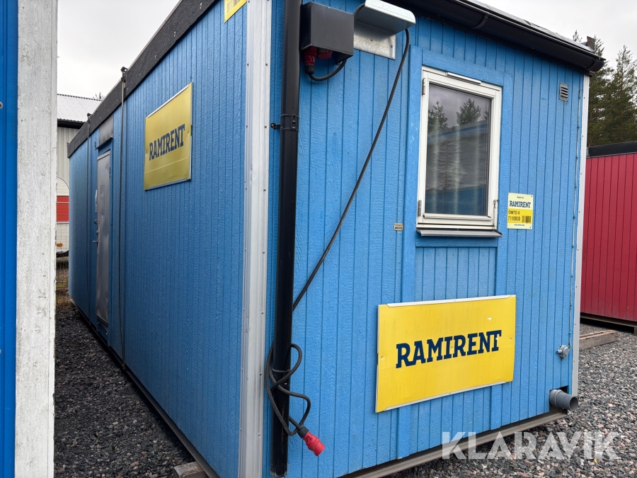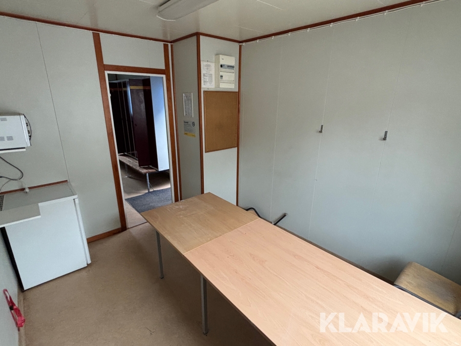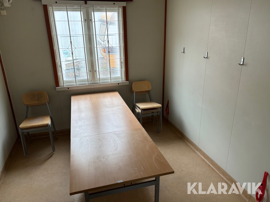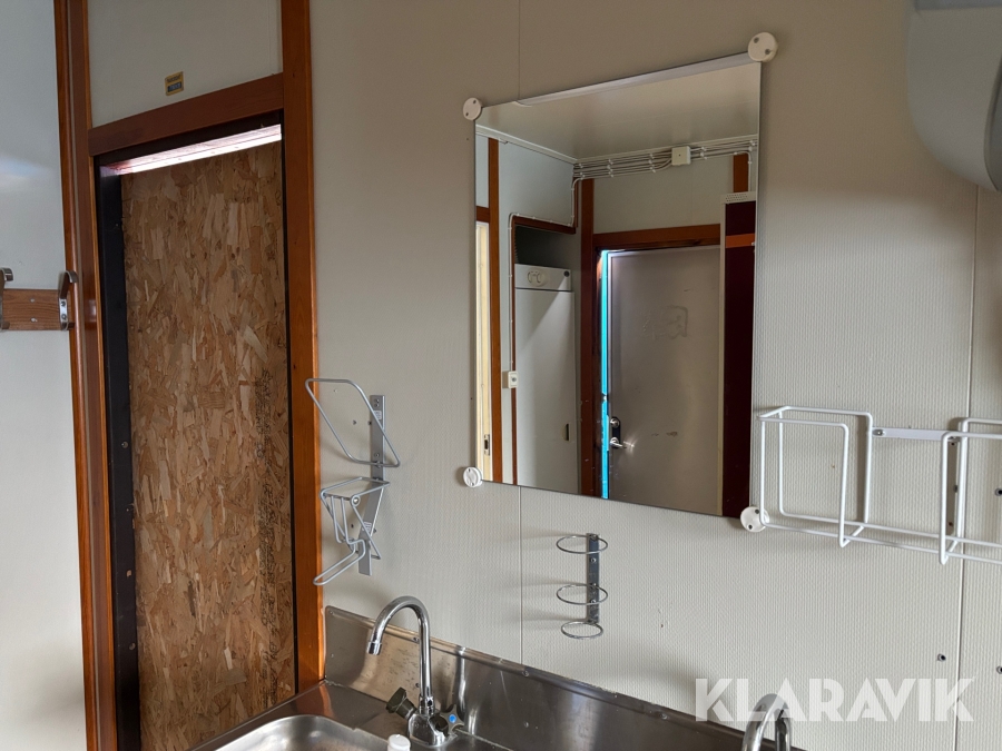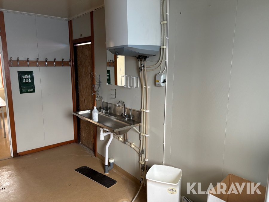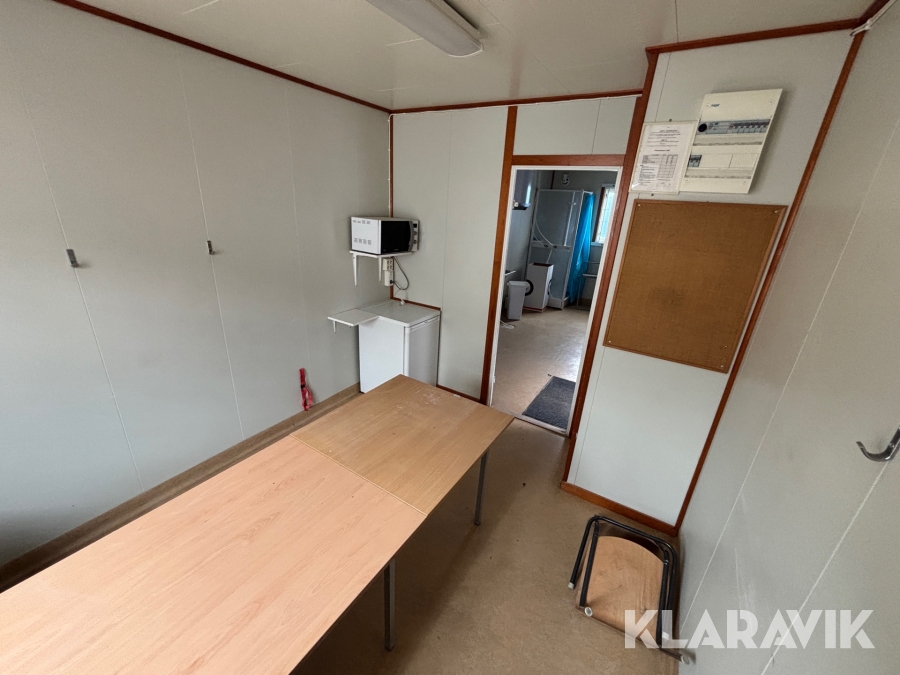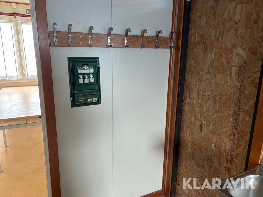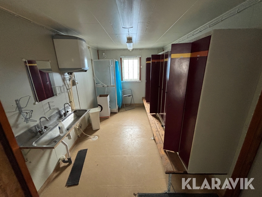 Mat och omklädningsplats för sex personer. Matplatsen består, utöver bord och stolar av ett kylskåp 190 L, en mikrovågsugn och en hylla för kaffebryggare. På väggarna sitter det krokar att hänga matväskorna på. Ett högskåp för förvaring av specerier. Omklädningsdelen innehåller klädskåp för sex personer, ett öppet och ett stängt. En tvättränna med två tappkranar och 100 L vvb, spegel, papperskorg, dispensers för olika typer av tvål och handkräm samt två torkskåp.