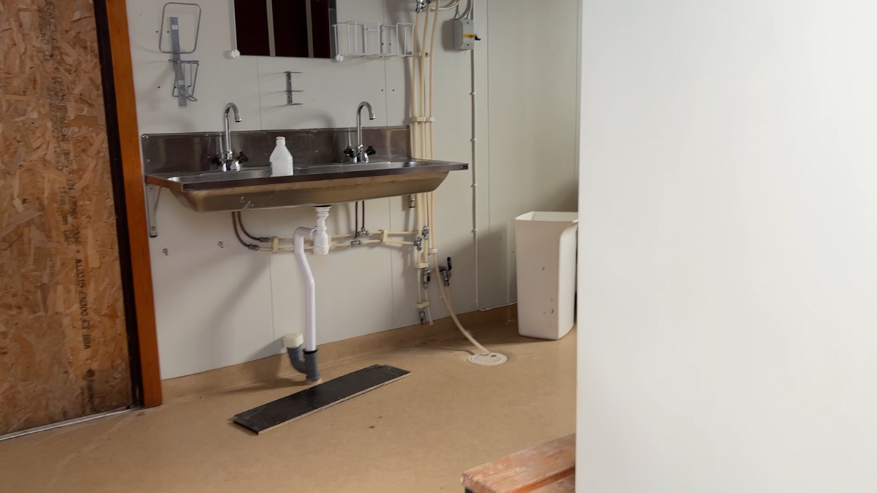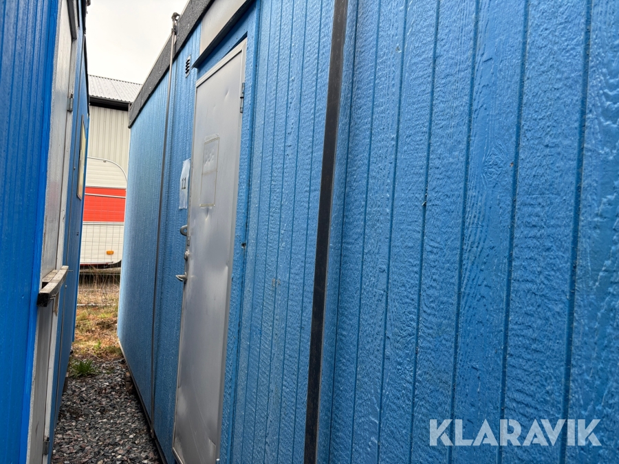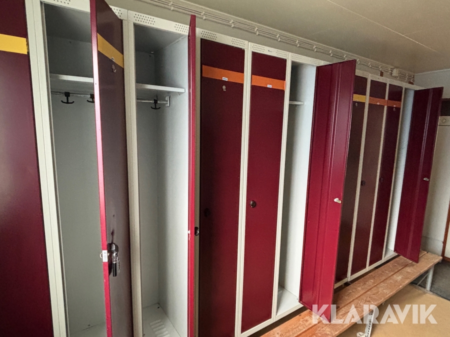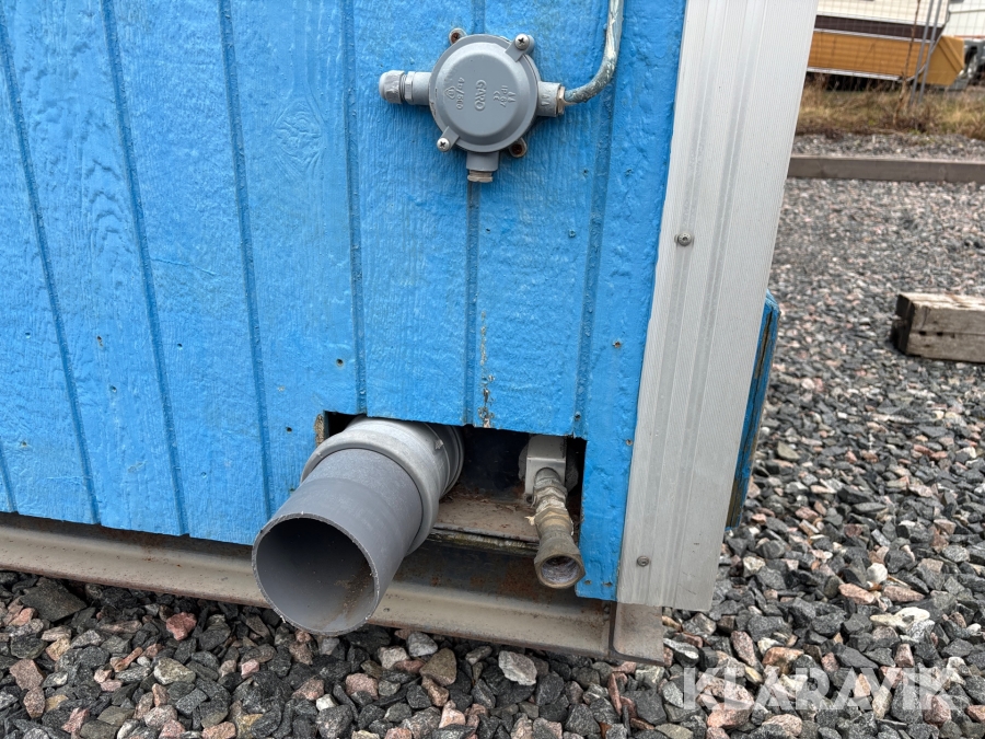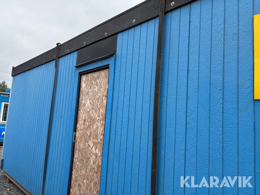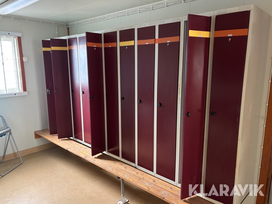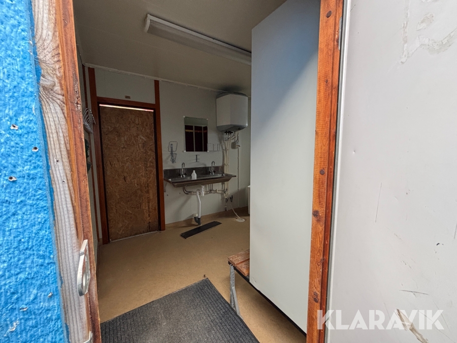 Mat och omklädningsplats för sex personer. Matplatsen består, utöver bord och stolar av ett kylskåp 190 L, en mikrovågsugn och en hylla för kaffebryggare. På väggarna sitter det krokar att hänga matväskorna på. Ett högskåp för förvaring av specerier. Omklädningsdelen innehåller klädskåp för sex personer, ett öppet och ett stängt. En tvättränna med två tappkranar och 100 L vvb, spegel, papperskorg, dispensers för olika typer av tvål och handkräm samt två torkskåp.