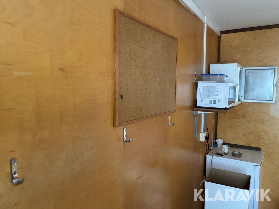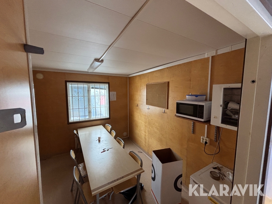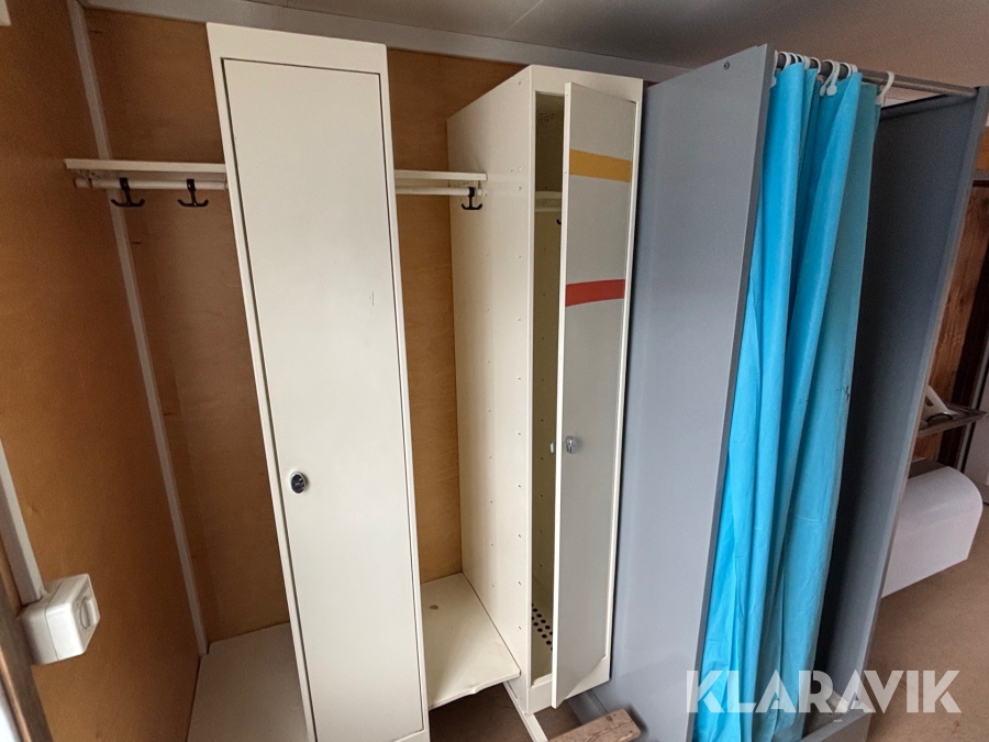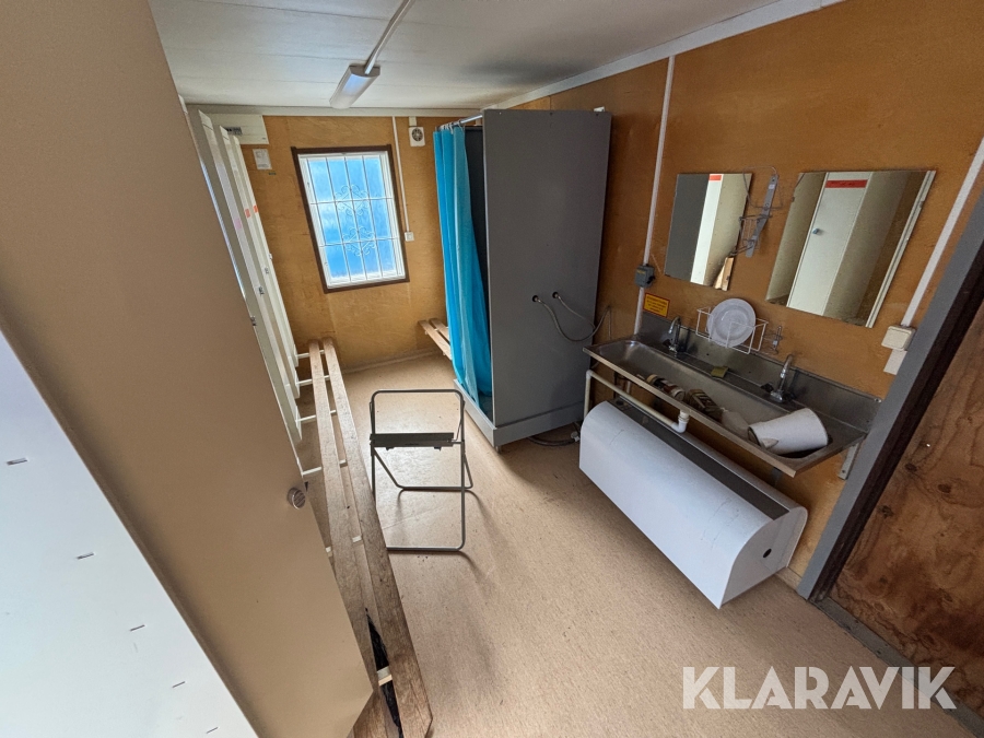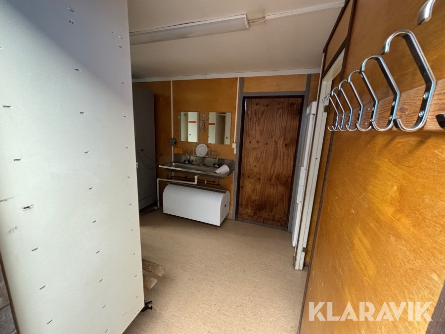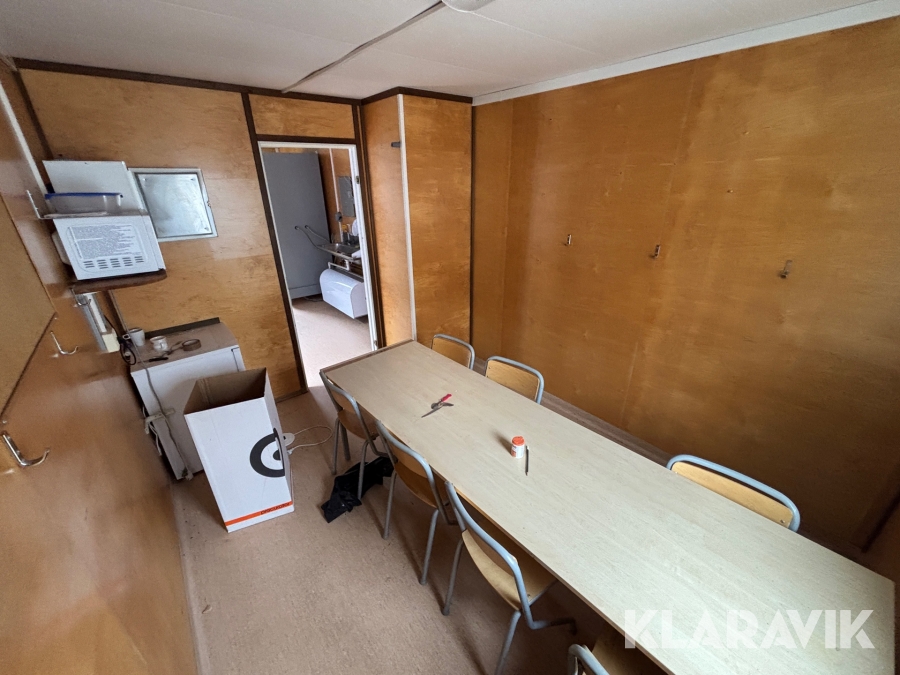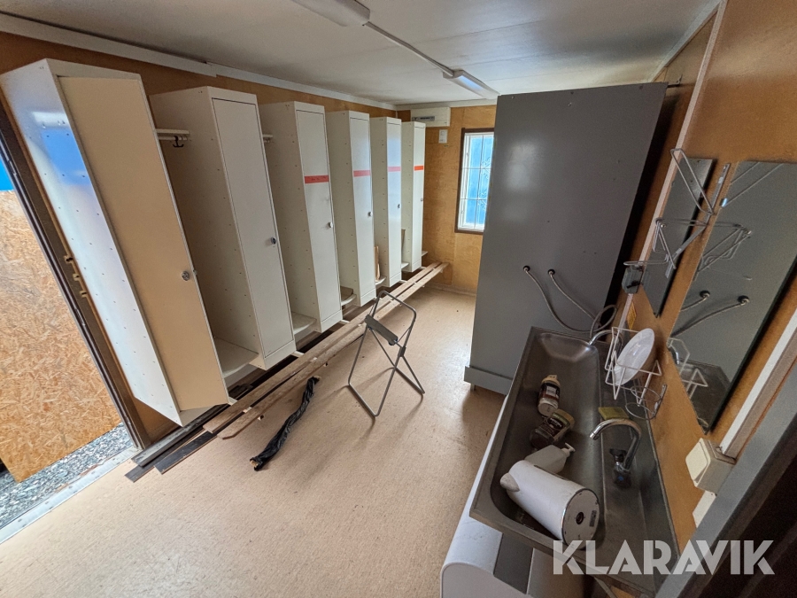 Mat och omklädningsplats för sex personer. Matplatsen består, utöver bord och stolar av ett kylskåp 190 L, en mikrovågsugn och en hylla för kaffebryggare. På väggarna sitter det krokar att hänga matväskorna på. Ett högskåp för förvaring av specerier. Omklädningsdelen innehåller klädskåp för sex personer, ett öppet och ett stängt. En tvättränna med två tappkranar och 100 L vvb, spegel, papperskorg, dispensers för olika typer av tvål och handkräm samt två torkskåp.