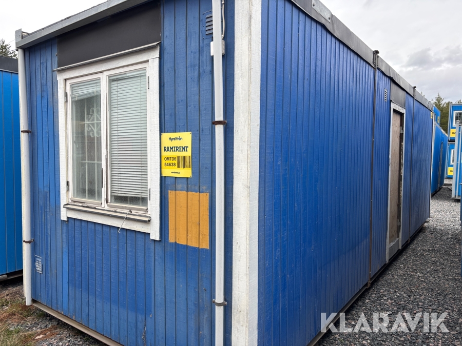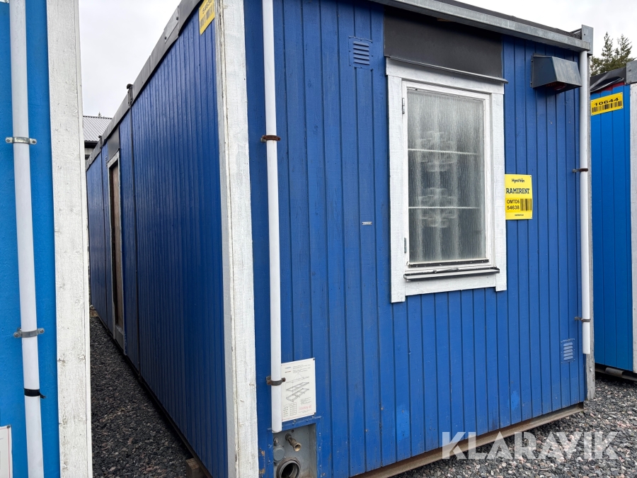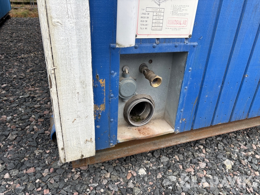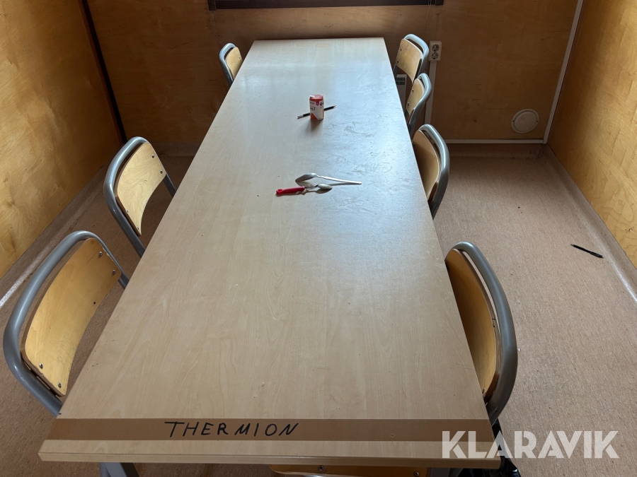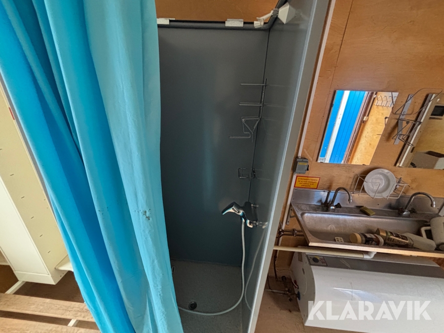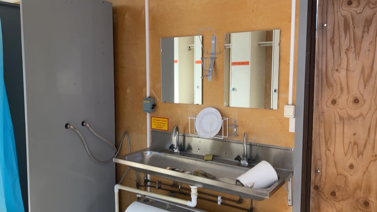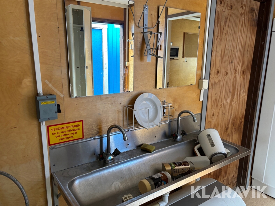 Mat och omklädningsplats för sex personer. Matplatsen består, utöver bord och stolar av ett kylskåp 190 L, en mikrovågsugn och en hylla för kaffebryggare. På väggarna sitter det krokar att hänga matväskorna på. Ett högskåp för förvaring av specerier. Omklädningsdelen innehåller klädskåp för sex personer, ett öppet och ett stängt. En tvättränna med två tappkranar och 100 L vvb, spegel, papperskorg, dispensers för olika typer av tvål och handkräm samt två torkskåp.
