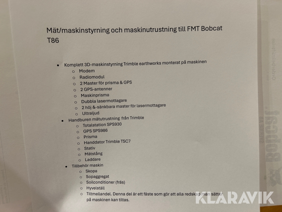 Väghyvel Bobcat T86 med hyvelställ, komplett mätutrustning, skopa, jordfräs & sopskopa