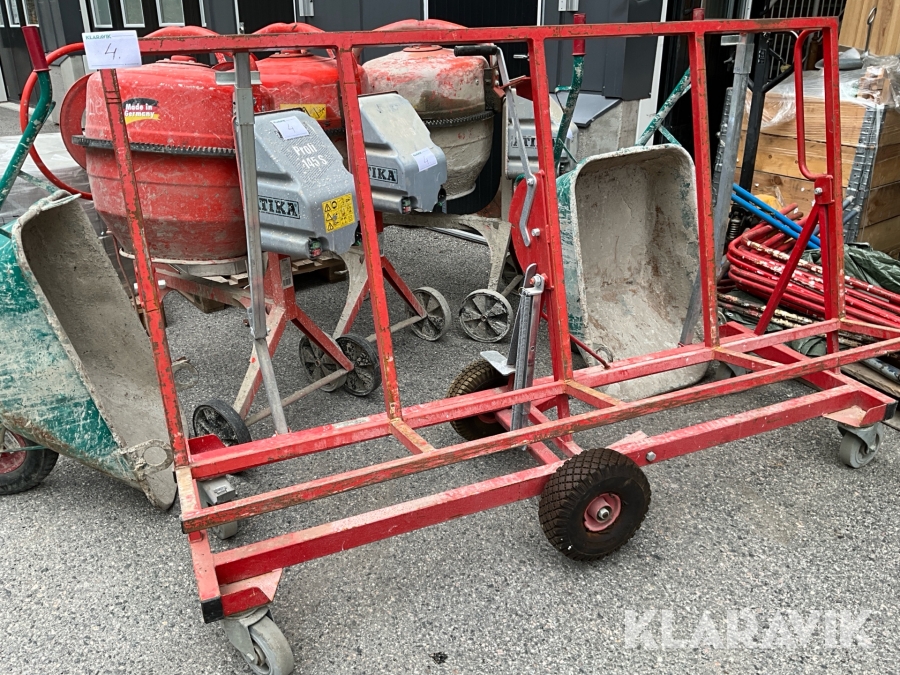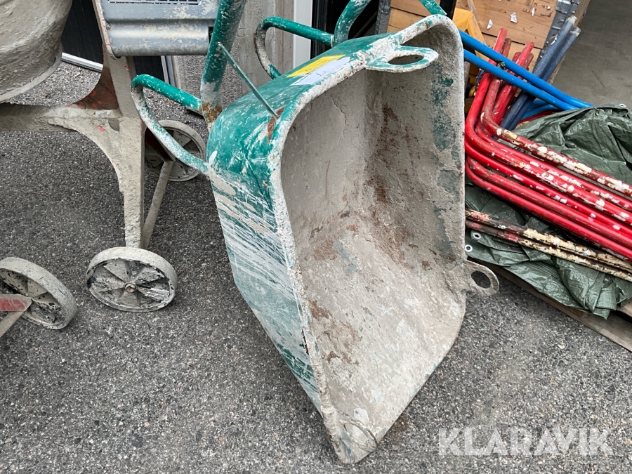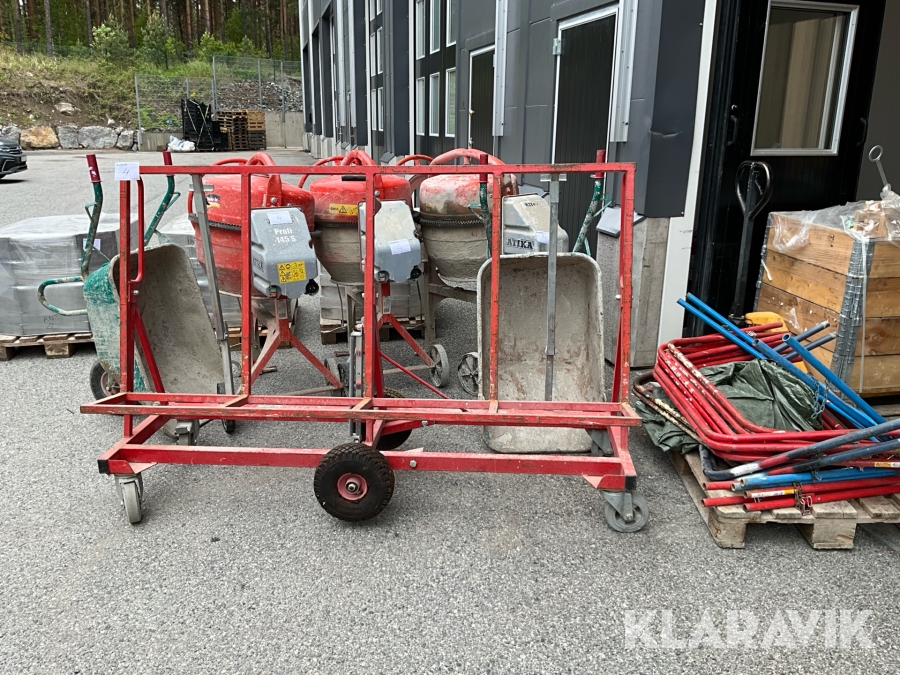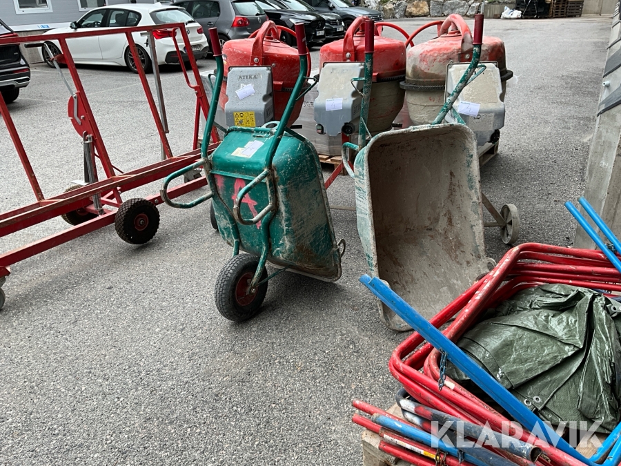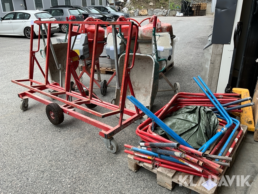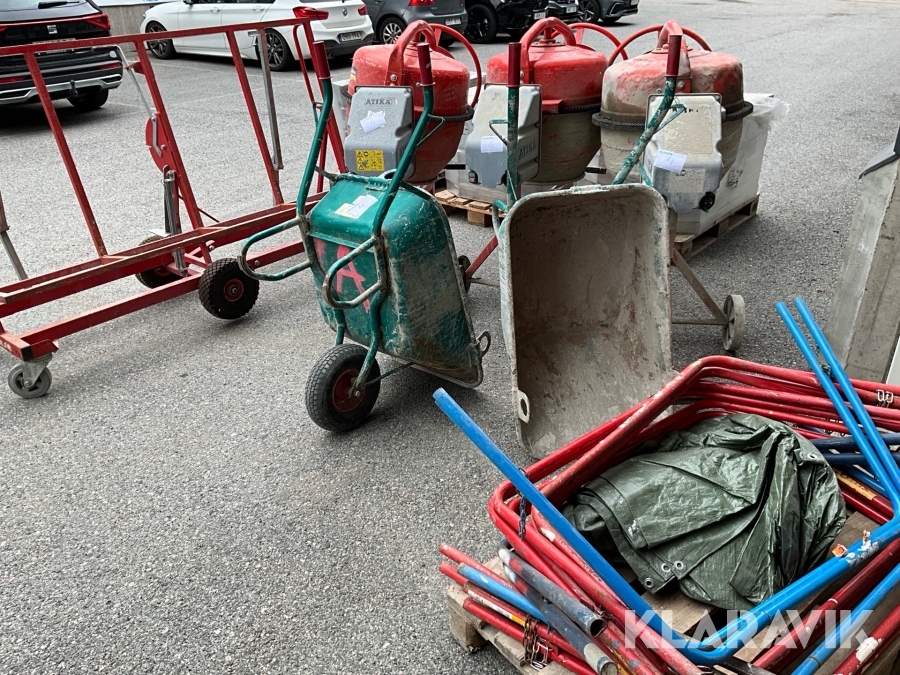 Byggutrustning cementblandare, gipsvagn, skottkärror, bockar