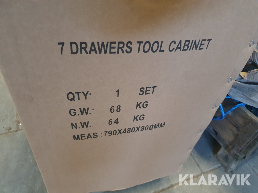 Vagn med verktyg tillverkad i stål med 7 lådor varav de 6 översta lådorna är fyllda med verktyg.