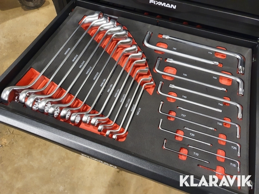 Verktygsvagn tillverkad i stål med totalt 13 lådor, varav de 11 översta är fyllda med 467 delar verktyg. Innehållet består bland annat av hylsnyckelsatser, skruvmejslar, ringnycklar, momentnyckel, hammare, elverktyg, elsortiment samt flera olika typer av tänger. För fullständig översikt, se bilder.