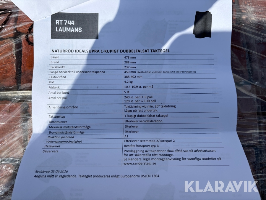 Tegelpannor Laumans 1-kup RT744/Idealsupra - ca 540 st