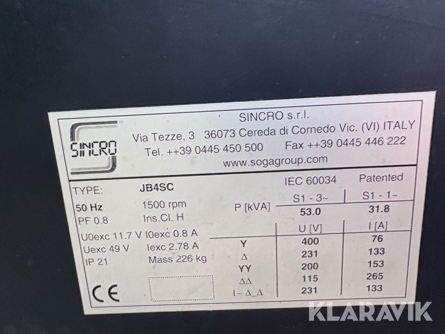 Generator Sincro JB4SC 53 kVA Med trepunktsfäste