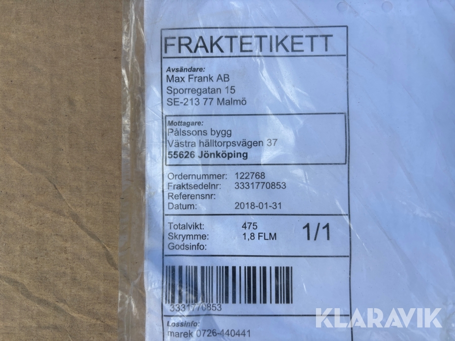 Boka frakt? Det finns ingen specifik information om frakt för just det här objektet, men om du skickar oss en förfrågan via vårt fraktformulär, så undersöker vi möjligheten. Paket, EU-pall eller större maskin? Klaravik har fraktavtal med Schenker och i de fall vi kan hjälpa till med frakt gäller det objekt som ryms i paket eller inom en EU-pall (upp till 120*80 cm och 990 kg). Det går att beställa frakt inom Sverige, dock inte till utlandet. Vid frakt på större maskiner rekommenderar vi gärna transportföretag som du kan kontakta.