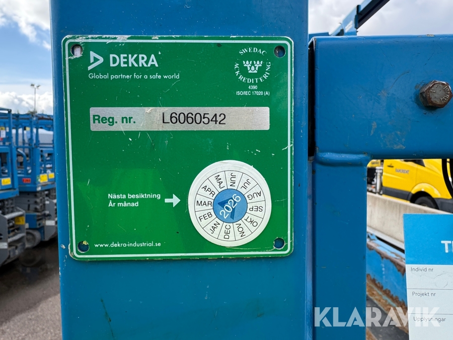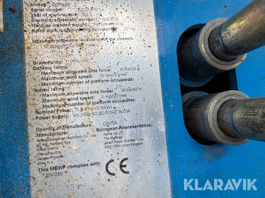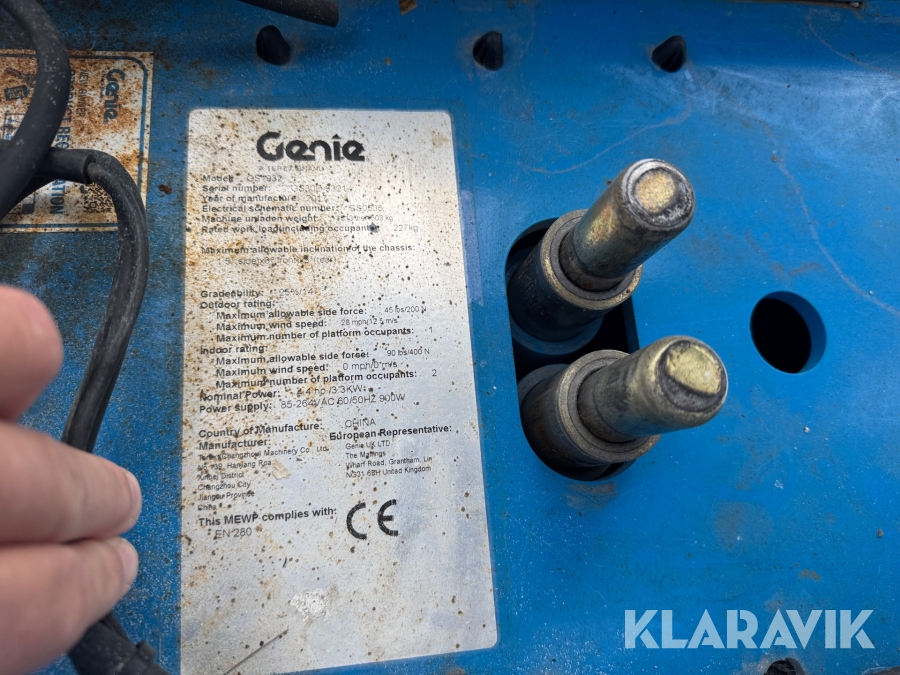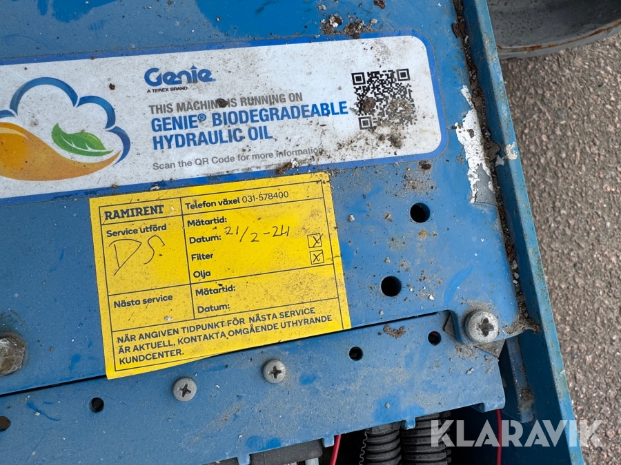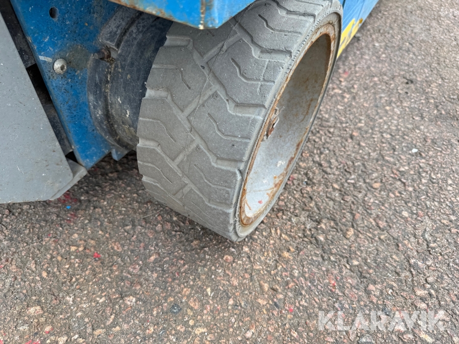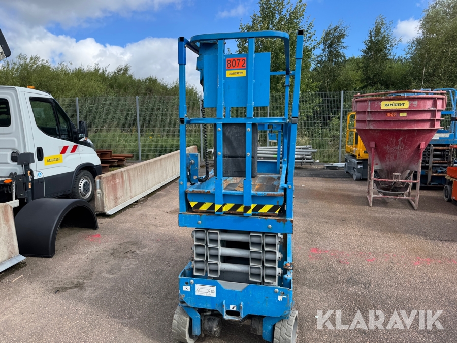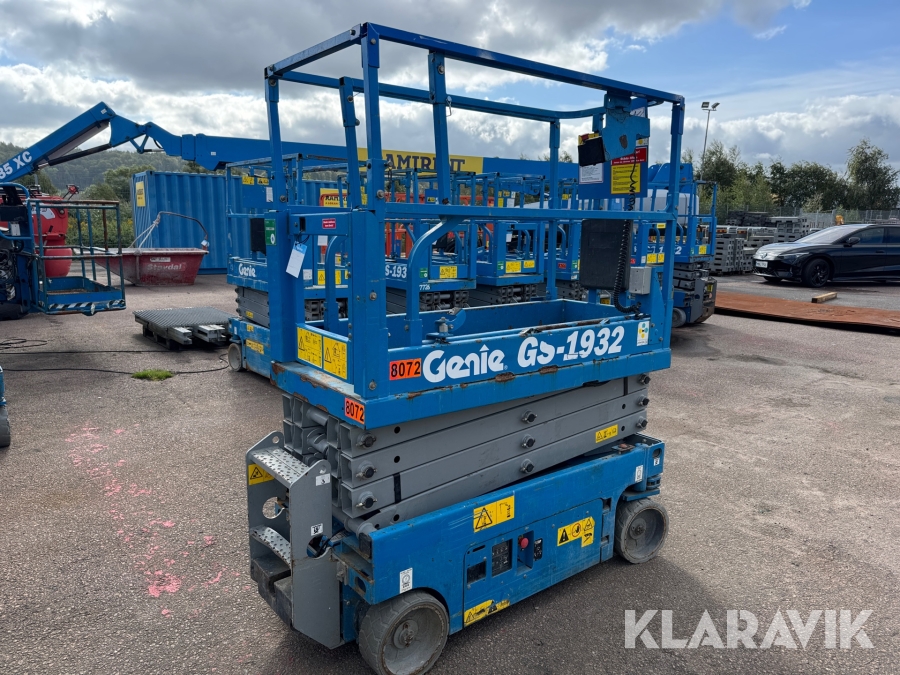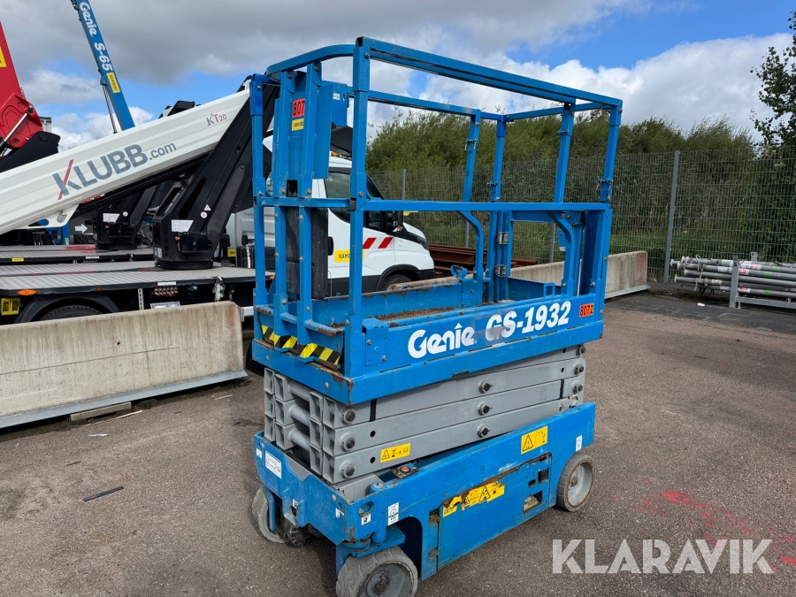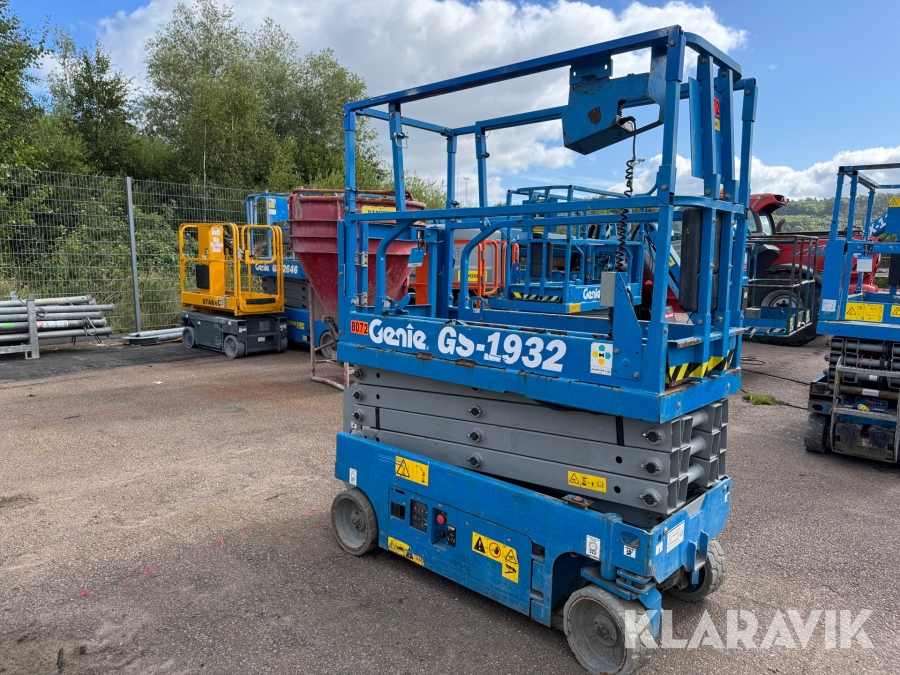 Genie GS-1932 är en eldriven saxlift med en maximal arbetshöjd på 7,8 meter och en plattformshöjd på 5,9 meter. Den har en lastkapacitet på 227 kg och en smal design med en bredd på 0,81 meter, vilket gör den enkel att manövrera i trånga utrymmen. Med batteridrift och icke-märkande däck är den idealisk för inomhusbruk i lager, butiker och andra känsliga miljöer. Liften väger cirka 1 500 kg, har en körhastighet på upp till 4 km/h och är utrustad med en utdragbar plattform för extra arbetsyta och flexibilitet.