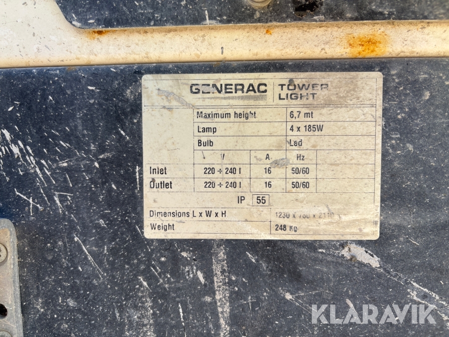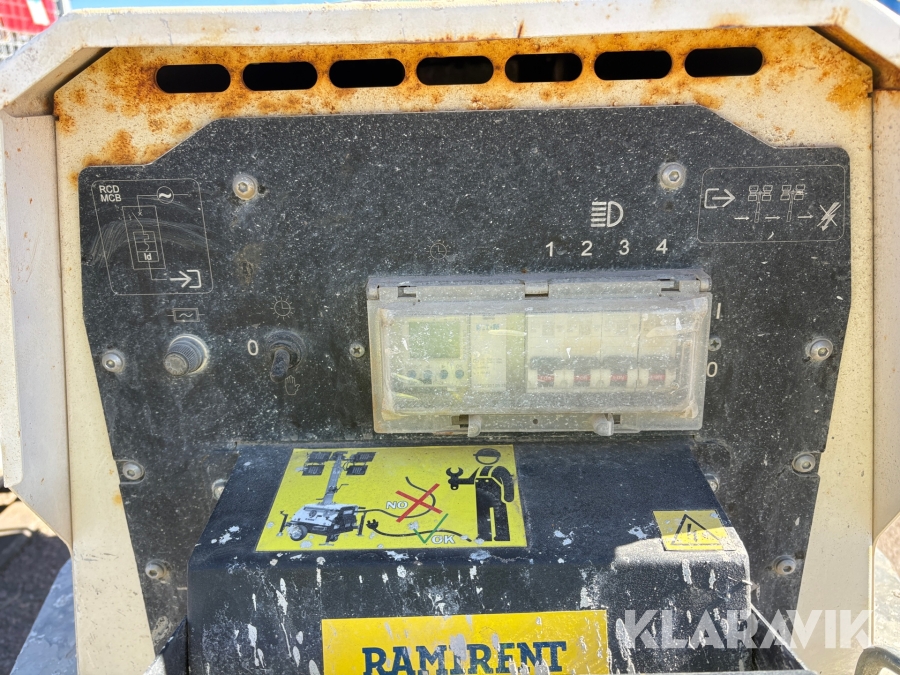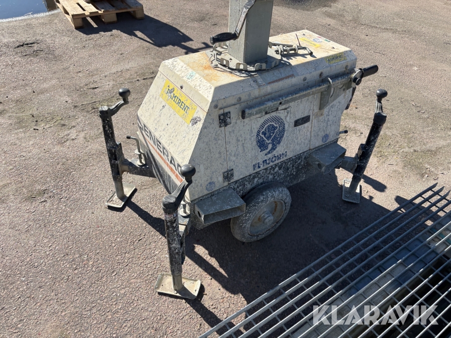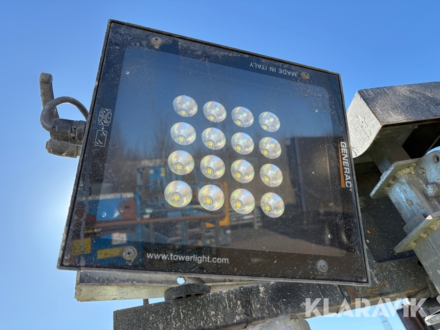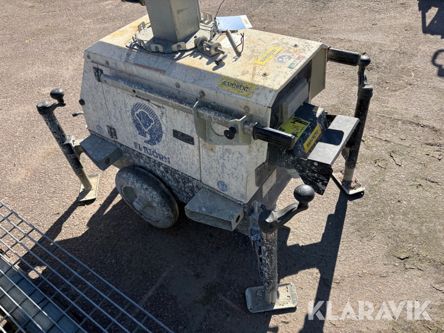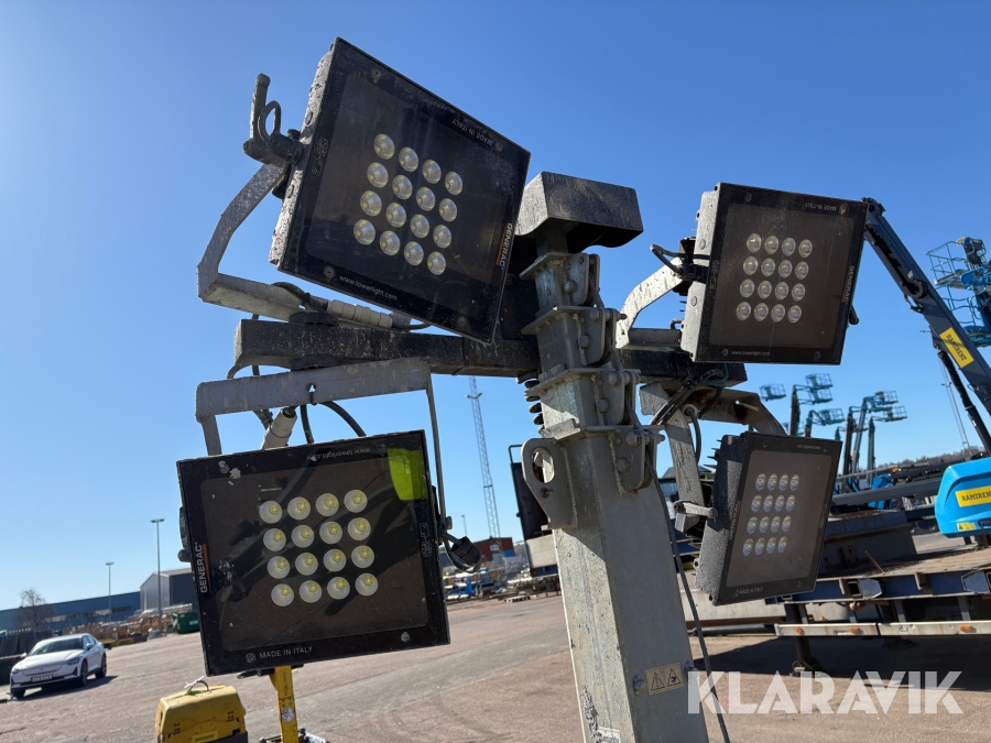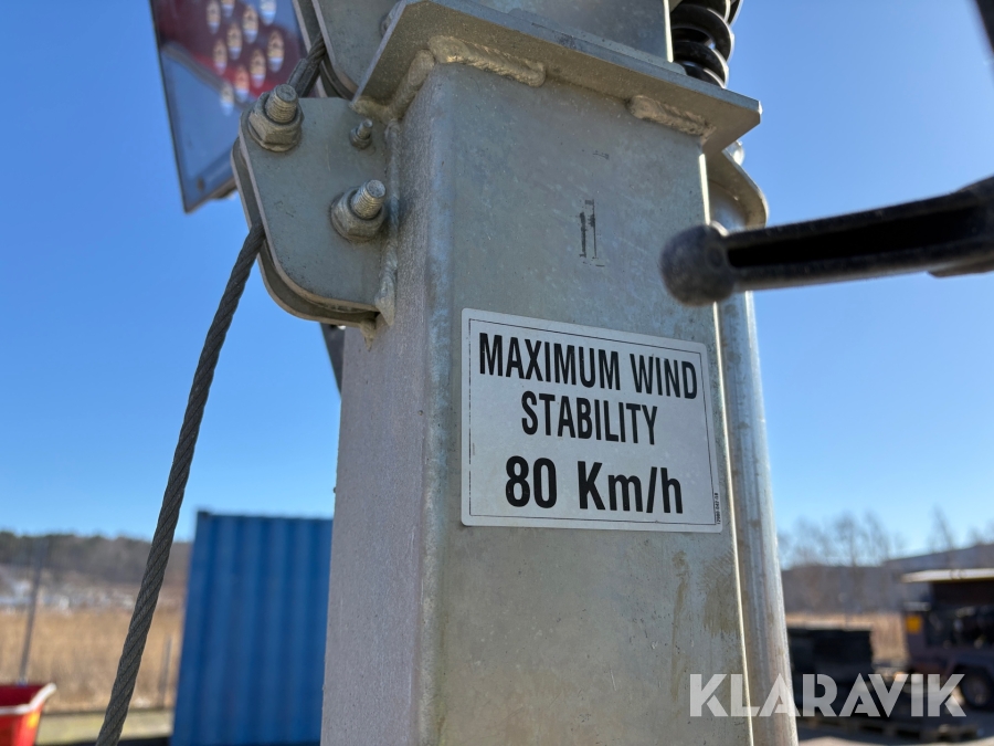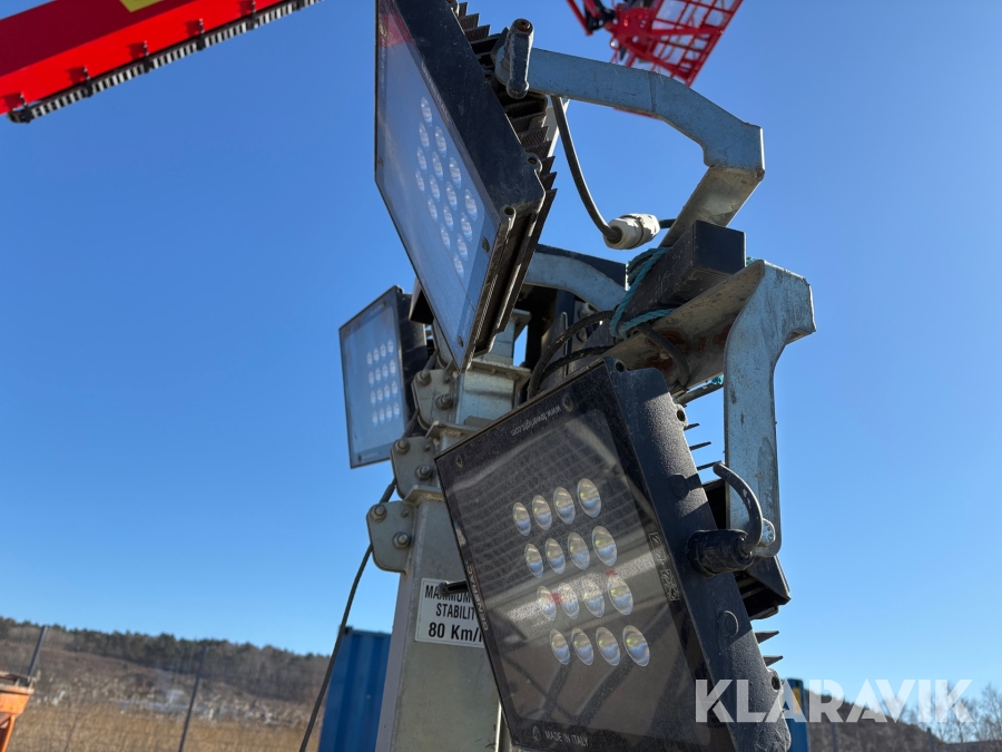 Belysningsmast med 4x150W LED-armaturer. Försedd med 230V intag och ett uttag för vidarematning. Utrustad med Plejd-relä för styrning av den dimbara belysningen, kan startas och stängas av manuellt. Har vev för att enkelt höja och sänka teleskopmasten, anpassad för lyft med truck eller lyftögla passar på pall. Försedd med hjul och handtag för smidig hantering på byggarbetsplatsen. Klarar vindstyrka på upp till 80km/h (22m/s).