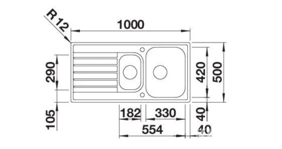 Diskho i rostfritt stål med en rymlig enkelho, avrinningsyta och separat avställningsdel. Utrustad med blandarhål Ø 35 mm, bräddavlopp samt korgventil med anpassat rörset och överinningsskydd. Passar för inbyggnad i skåp med minsta möjliga bredd på 60 cm.