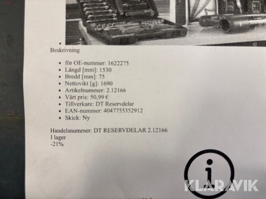 Boka frakt? Det finns ingen specifik information om frakt för just det här objektet, men om du skickar oss en förfrågan via vårt fraktformulär, så undersöker vi möjligheten. Paket, EU-pall eller större maskin? Klaravik har fraktavtal med Schenker och i de fall vi kan hjälpa till med frakt gäller det objekt som ryms i paket eller inom en EU-pall (upp till 120*80 cm och 990 kg). Det går att beställa frakt inom Sverige, dock inte till utlandet. Vid frakt på större maskiner rekommenderar vi gärna transportföretag som du kan kontakta.