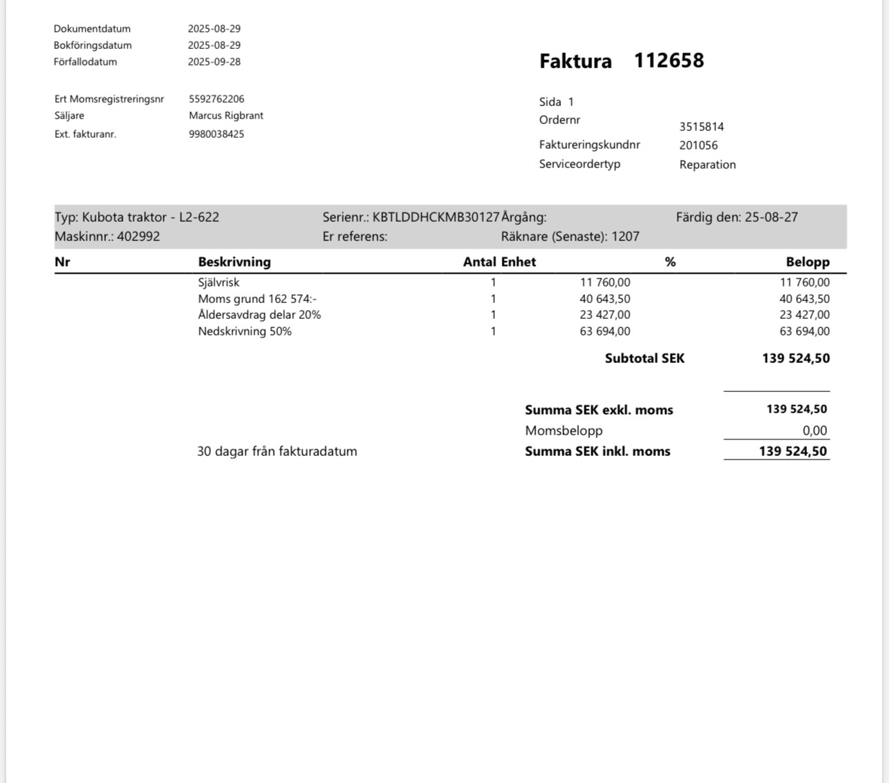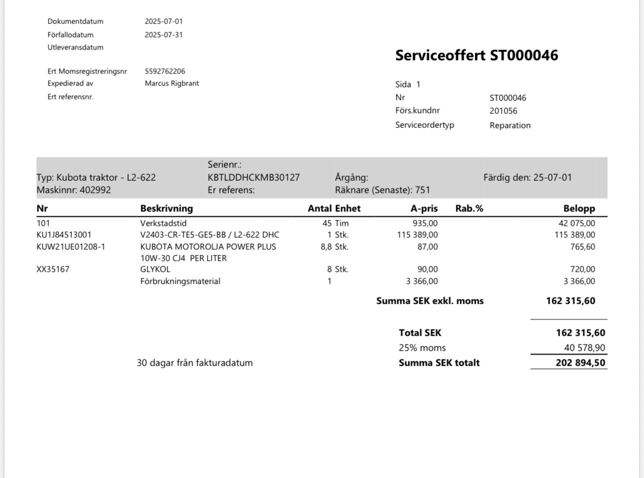 • Serie/chassinummer framgår