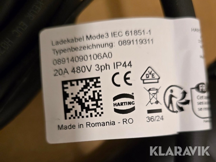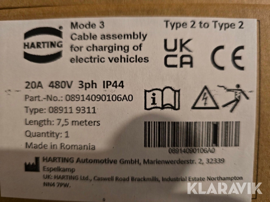 Laddkablar Harting 5st Typ 2, mode 3, 11kW, 7.5m