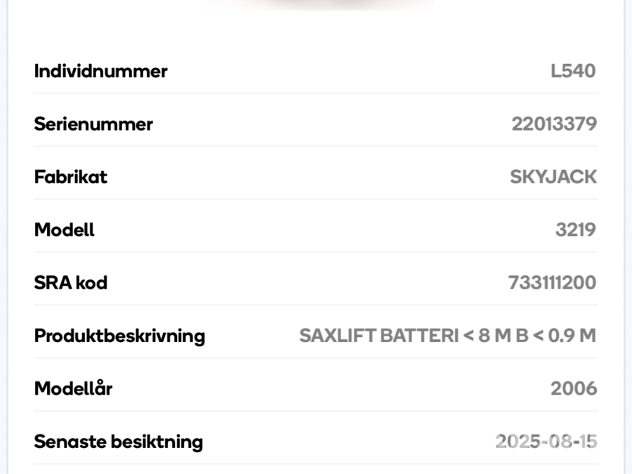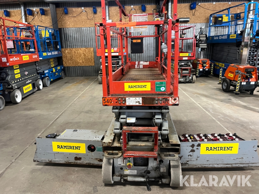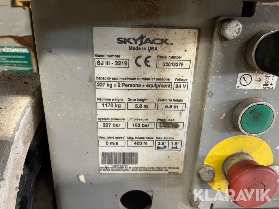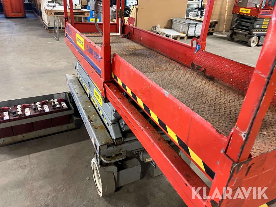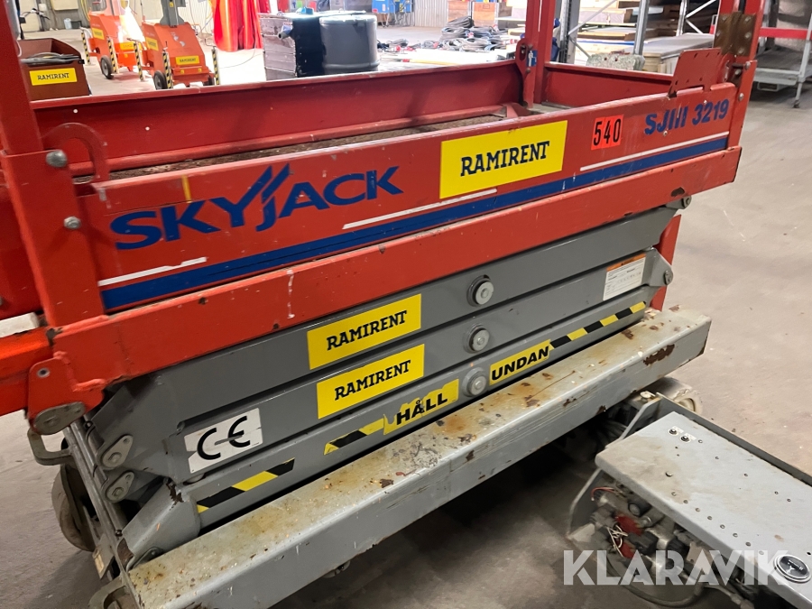 Skyjack SJ 3219 är en eldriven saxlift med en maximal arbetshöjd på 7,8 meter och en plattformshöjd på 5,8 meter. Den har en lastkapacitet på 227 kg och en smal design med en bredd på 0,81 meter, vilket gör den enkel att manövrera i trånga utrymmen. Med batteridrift och icke-märkande däck är den idealisk för inomhusbruk i lager, butiker och industrier. Liften väger cirka 1 170 kg, har en körhastighet på upp till 3,2 km/h och är utrustad med en utdragbar plattform för extra arbetsyta och flexibilitet.