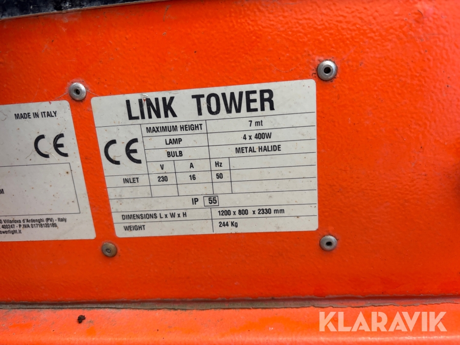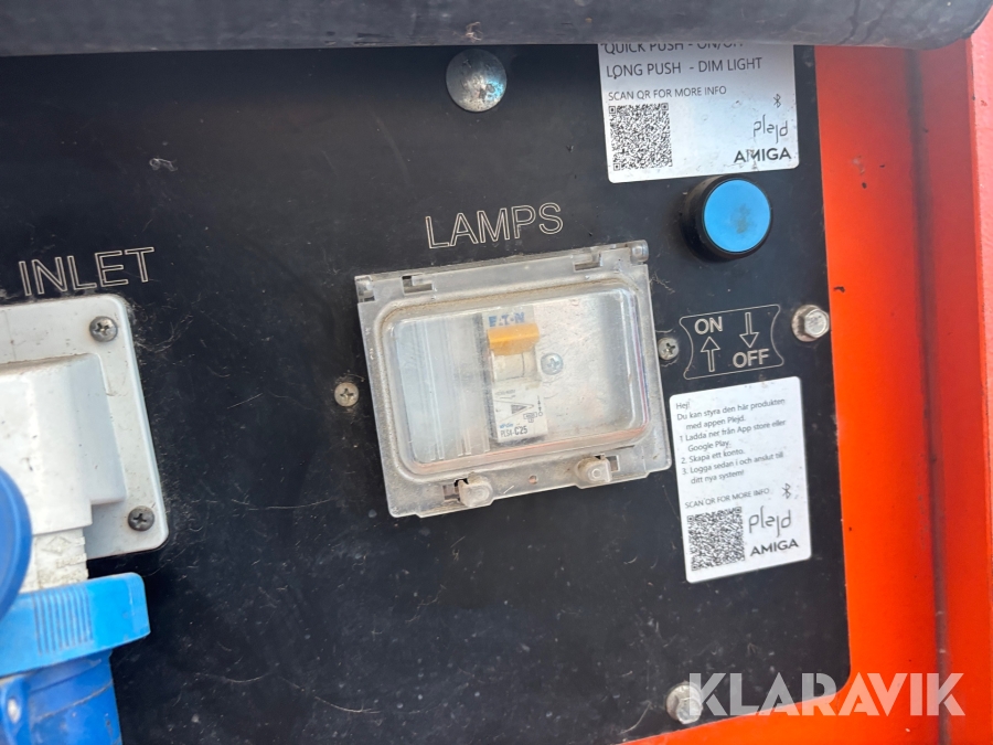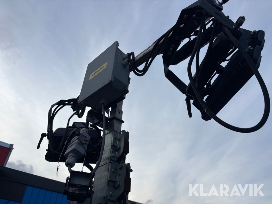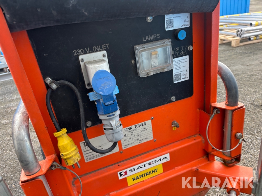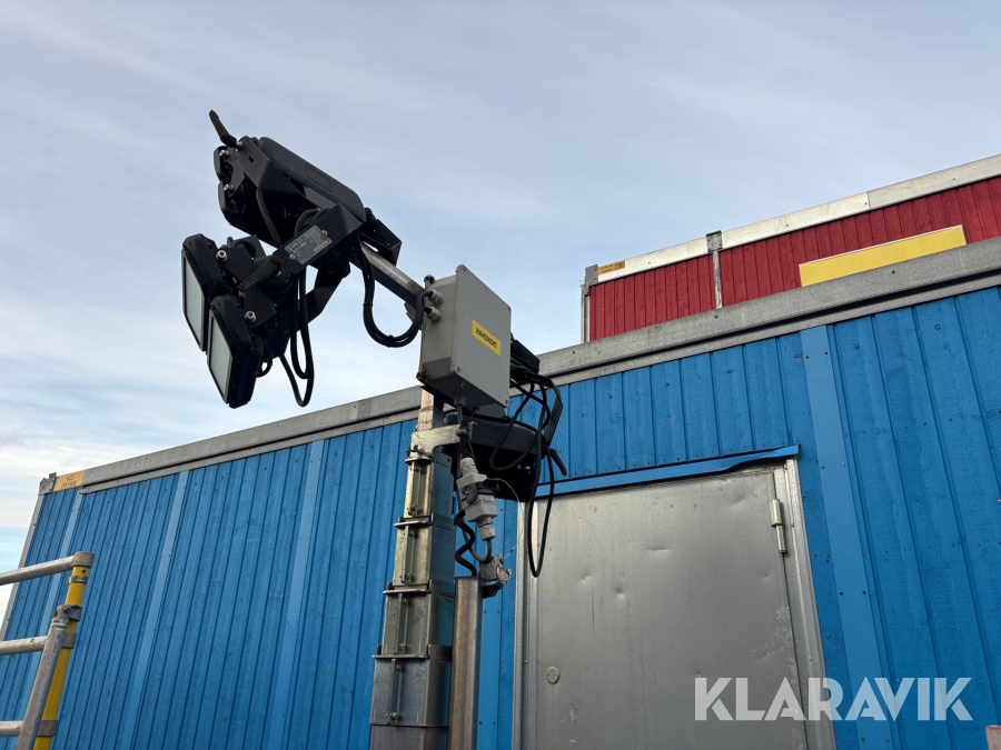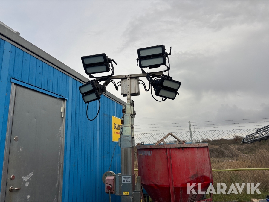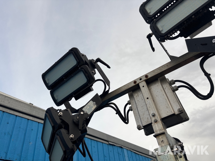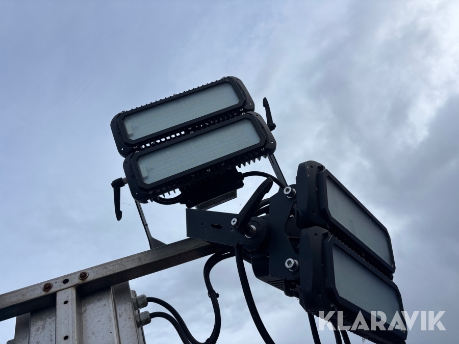 Belysningsmast med 4x150W LED-armaturer. Försedd med 230V intag och ett uttag för vidarematning. Utrustad med Plejd-relä för styrning av den dimbara belysningen, kan startas och stängas av manuellt. Har vev för att enkelt höja och sänka teleskopmasten, anpassad för lyft med truck eller lyftögla passar på pall. Försedd med hjul och handtag för smidig hantering på byggarbetsplatsen. Klarar vindstyrka på upp till 80km/h (22m/s).