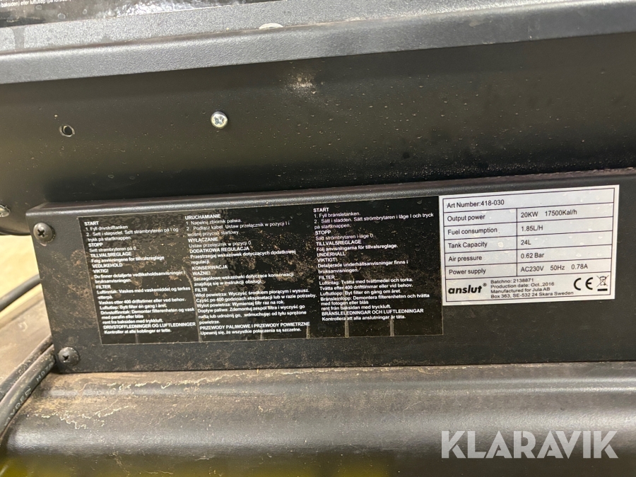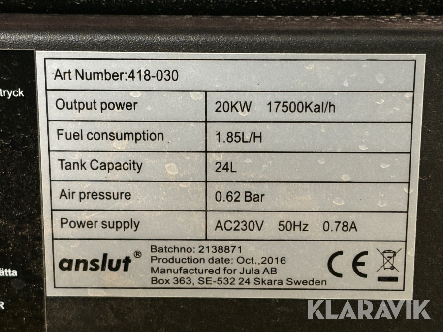 Boka frakt? Det finns ingen specifik information om frakt för just det här objektet, men om du skickar oss en förfrågan via vårt fraktformulär, så undersöker vi möjligheten. Paket, EU-pall eller större maskin? Klaravik har fraktavtal med Schenker och i de fall vi kan hjälpa till med frakt gäller det objekt som ryms i paket eller inom en EU-pall (upp till 120*80 cm och 990 kg). Det går att beställa frakt inom Sverige, dock inte till utlandet. Vid frakt på större maskiner rekommenderar vi gärna transportföretag som du kan kontakta.