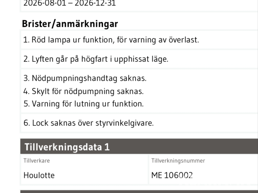 Anmärkningar från senaste besiktning: