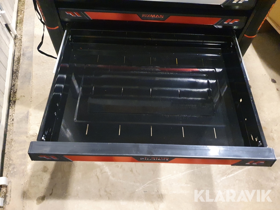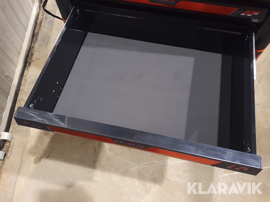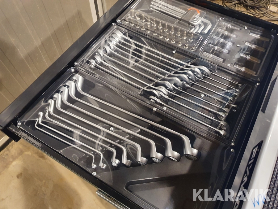 Vagn med verktyg tillverkad i stål med 7 lådor varav de 4 översta lådorna är fyllda med verktyg.