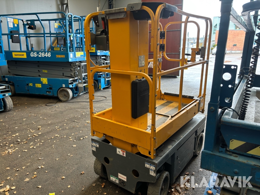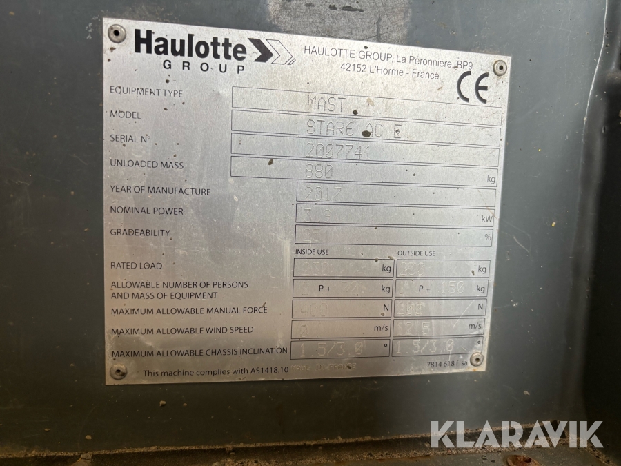 HAULOTTE STAR6+ är en eldriven pelarlift med en arbetshöjd på 5,8 meter och en plattformshöjd på 3,8 meter. Den har en högre lastkapacitet på 230 kg och en rymligare plattform med en utdragbar del för ökad räckvidd. Med icke-märkande däck och tyst batteridrift är den idealisk för inomhusbruk i lager, butiker och andra trånga miljöer. Den väger 885 kg, har en körhastighet på upp till 4,5 km/h och erbjuder stabilitet samt smidig manövrering för säkert och effektivt arbete på höjd.