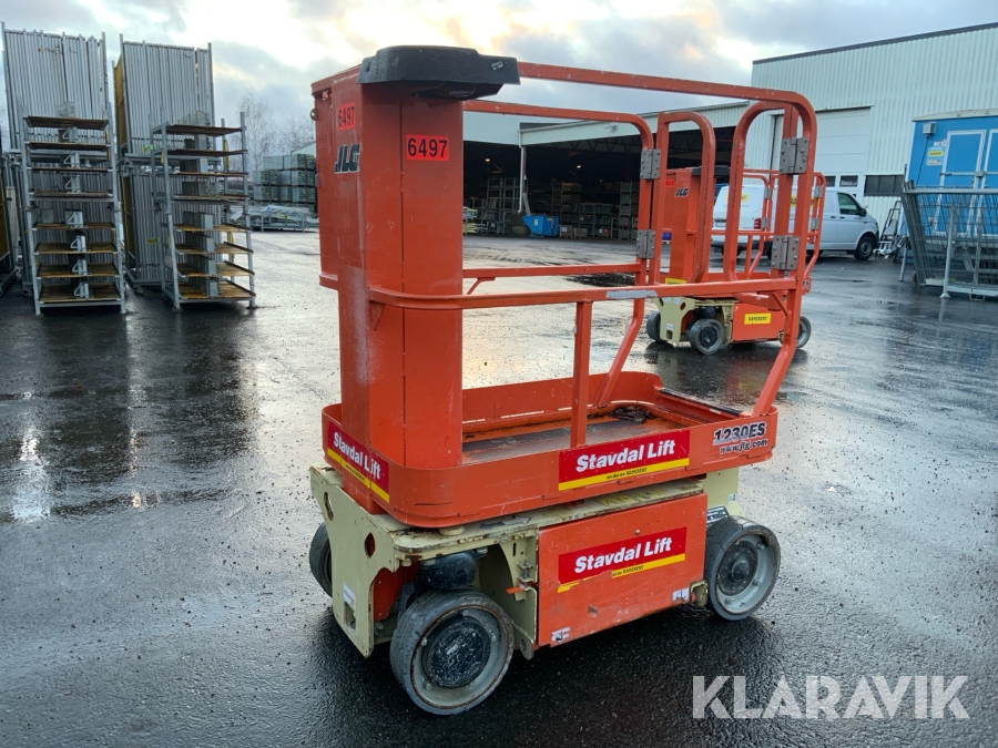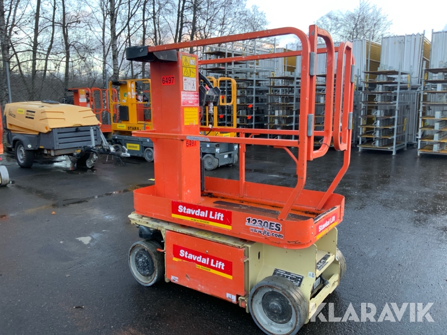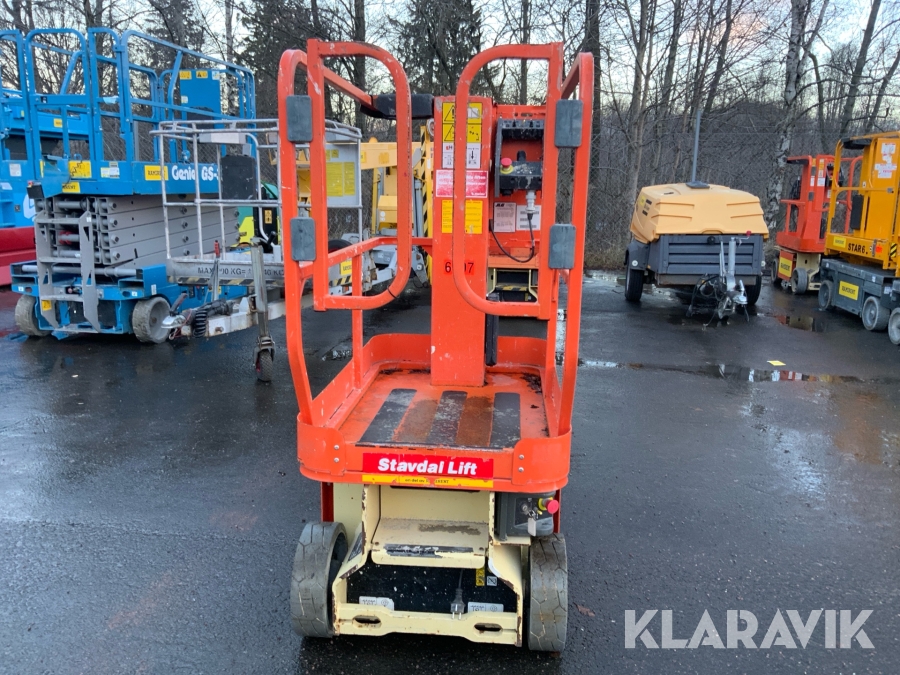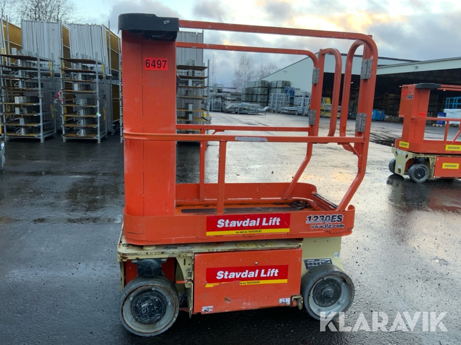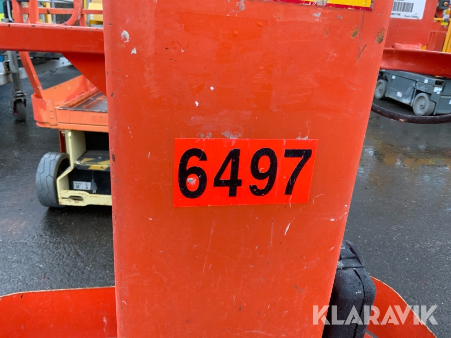 JLG 1230ES är en kompakt och eldriven pelarlift som är idealisk för arbete på höjd i trånga inomhusmiljöer. Med en arbetshöjd på upp till 5,66 meter och en plattformskapacitet på 230 kg erbjuder den en stabil och säker arbetsplattform för en person med verktyg. Dess smala bredd på endast 0,76 meter och låga vikt på cirka 790 kg gör den lätt att manövrera genom standarddörrar och i hissar, vilket underlättar arbete i begränsade utrymmen. Med en svängradie på endast 13 cm och en körhastighet på upp till 4,8 km/h i nedfällt läge är den mycket lättmanövrerad. Säkerhetsfunktioner som lutningssensor, potthålsskydd och varningslarm är standard, vilket gör JLG 1230ES till ett pålitligt val för underhålls- och installationsarbeten inomhus.
