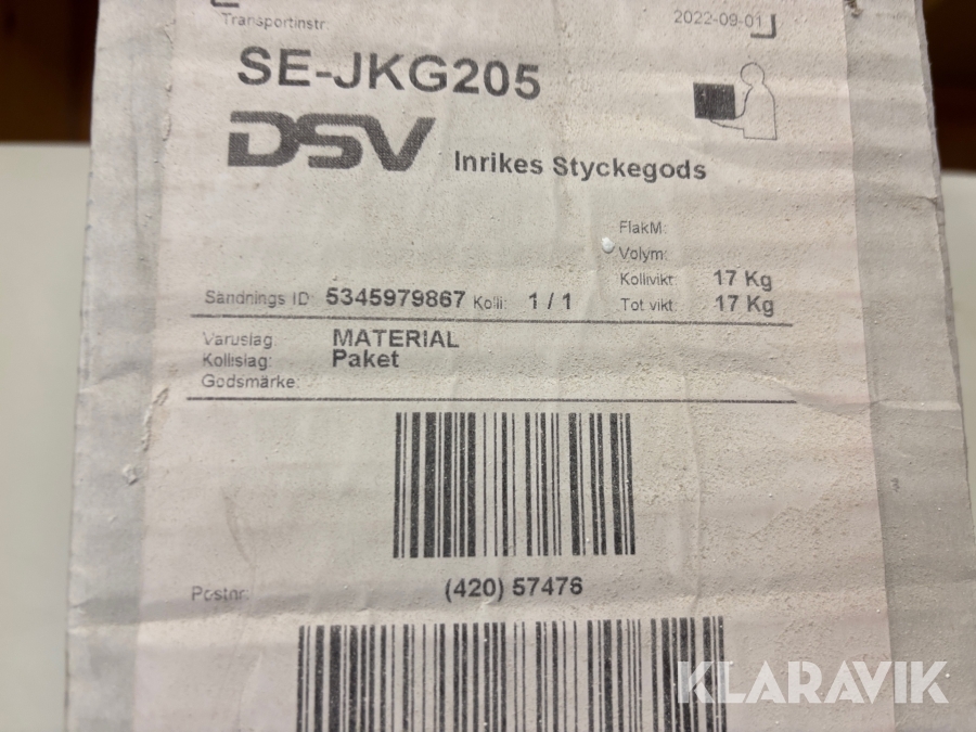 Boka frakt? Det finns ingen specifik information om frakt för just det här objektet, men om du skickar oss en förfrågan via vårt fraktformulär, så undersöker vi möjligheten. Paket, EU-pall eller större maskin? Klaravik har fraktavtal med Schenker och i de fall vi kan hjälpa till med frakt gäller det objekt som ryms i paket eller inom en EU-pall (upp till 120*80 cm och 990 kg). Det går att beställa frakt inom Sverige, dock inte till utlandet. Vid frakt på större maskiner rekommenderar vi gärna transportföretag som du kan kontakta.