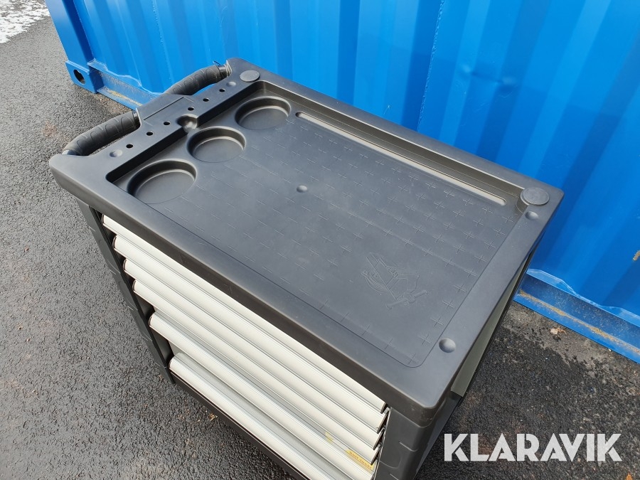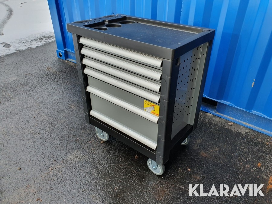 Vagn för verktyg tillverkad i stål med 6 lådor varav de 4 översta lådorna är fyllda med verktyg.