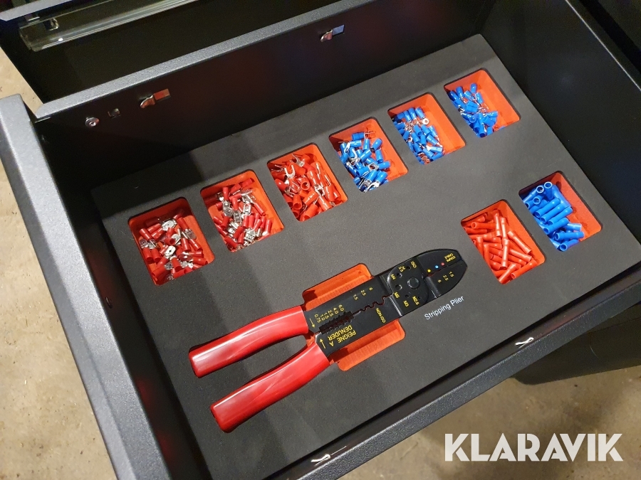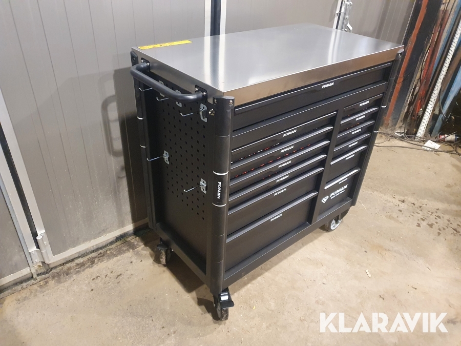 Vagn för verktyg tillverkad i stål med 13 lådor varav de 11 översta lådorna är fyllda med 467 st verktyg.