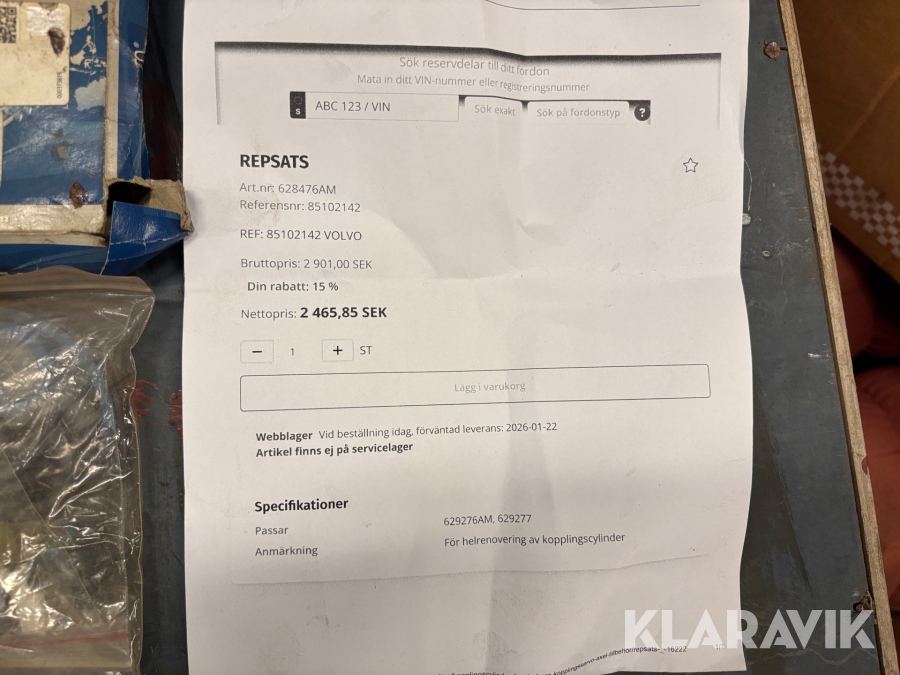 Boka frakt? Det finns ingen specifik information om frakt för just det här objektet, men om du skickar oss en förfrågan via vårt fraktformulär, så undersöker vi möjligheten. Paket, EU-pall eller större maskin? Klaravik har fraktavtal med Schenker och i de fall vi kan hjälpa till med frakt gäller det objekt som ryms i paket eller inom en EU-pall (upp till 120*80 cm och 990 kg). Det går att beställa frakt inom Sverige, dock inte till utlandet. Vid frakt på större maskiner rekommenderar vi gärna transportföretag som du kan kontakta.
