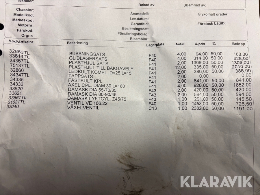 Boka frakt? Det finns ingen specifik information om frakt för just det här objektet, men om du skickar oss en förfrågan via vårt fraktformulär, så undersöker vi möjligheten. Paket, EU-pall eller större maskin? Klaravik har fraktavtal med Schenker och i de fall vi kan hjälpa till med frakt gäller det objekt som ryms i paket eller inom en EU-pall (upp till 120*80 cm och 990 kg). Det går att beställa frakt inom Sverige, dock inte till utlandet. Vid frakt på större maskiner rekommenderar vi gärna transportföretag som du kan kontakta.