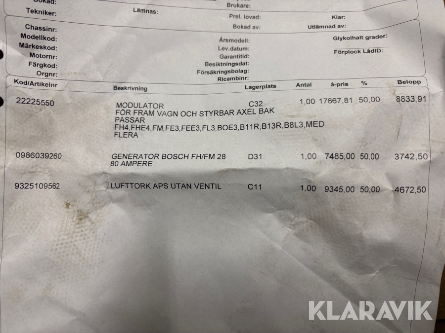 Boka frakt? Det finns ingen specifik information om frakt för just det här objektet, men om du skickar oss en förfrågan via vårt fraktformulär, så undersöker vi möjligheten. Paket, EU-pall eller större maskin? Klaravik har fraktavtal med Schenker och i de fall vi kan hjälpa till med frakt gäller det objekt som ryms i paket eller inom en EU-pall (upp till 120*80 cm och 990 kg). Det går att beställa frakt inom Sverige, dock inte till utlandet. Vid frakt på större maskiner rekommenderar vi gärna transportföretag som du kan kontakta.