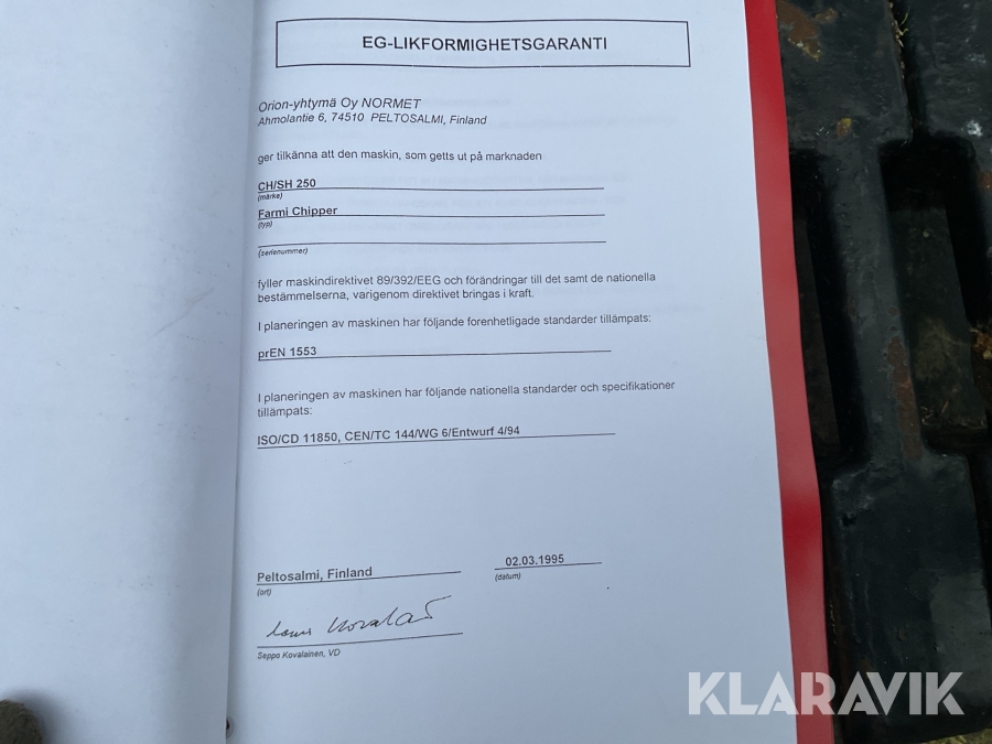 Boka frakt? Det finns ingen specifik information om frakt för just det här objektet, men om du skickar oss en förfrågan via vårt fraktformulär, så undersöker vi möjligheten. Paket, EU-pall eller större maskin? Klaravik har fraktavtal med Schenker och i de fall vi kan hjälpa till med frakt gäller det objekt som ryms i paket eller inom en EU-pall (upp till 120*80 cm och 990 kg). Det går att beställa frakt inom Sverige, dock inte till utlandet. Vid frakt på större maskiner rekommenderar vi gärna transportföretag som du kan kontakta.